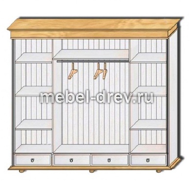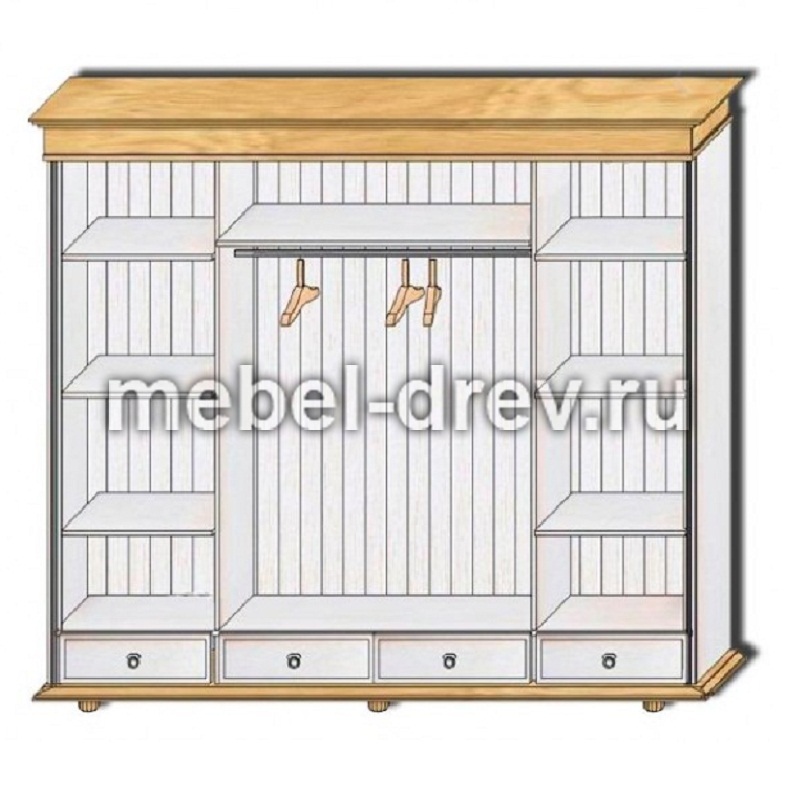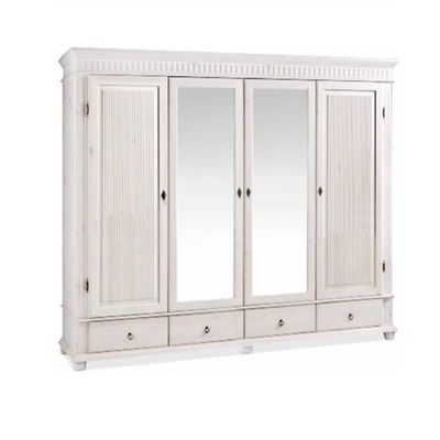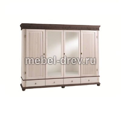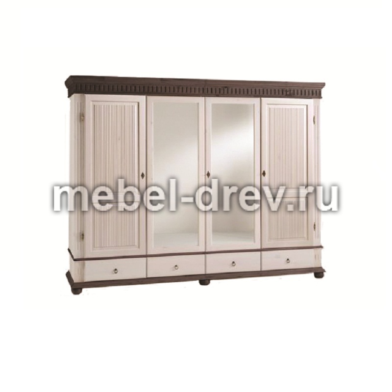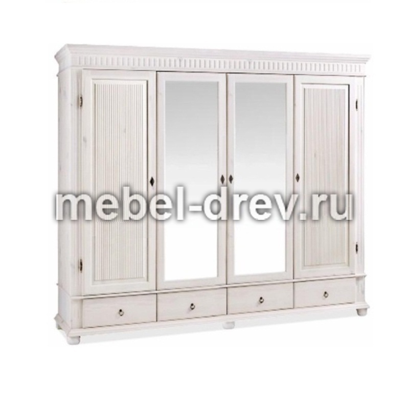 Четырехдверный высокий шкаф с зеркалами. Надежная и красивая белорусская мебель из натурального дерева. Четыре выдвижных ящика на металлических направляющих. Крайнее левое и правое отделение - с полками. Двойное центральное отделение - бельевое, с штангой под платье. Два зеркала на центральных дверцах. Задняя стенка шкафа - вагонка. Все двери деревянные со сплошной филенкой (рисунок дверец). Ручки-металлические.