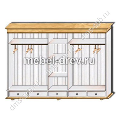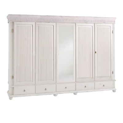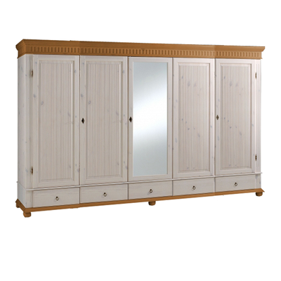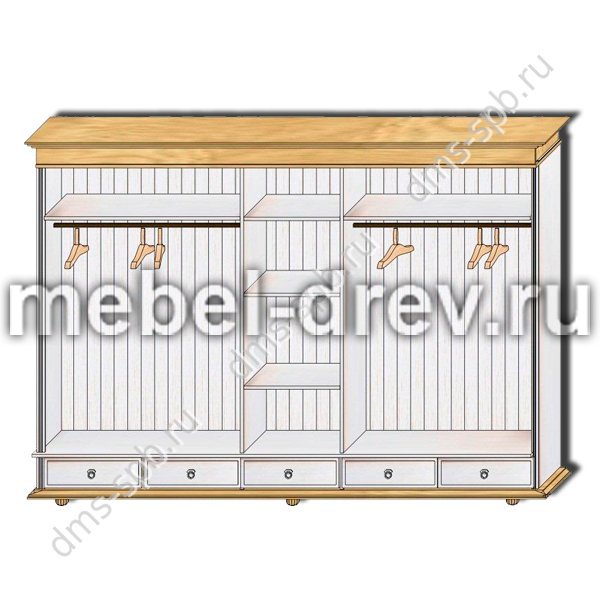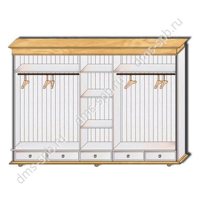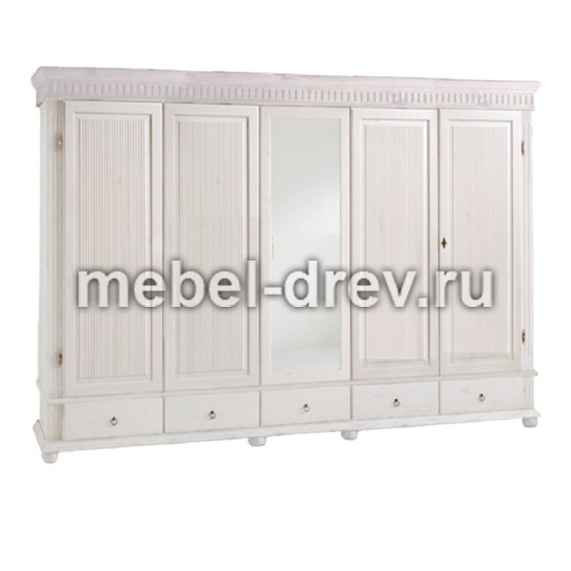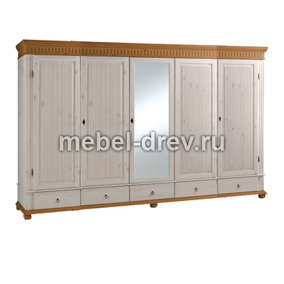 Пятидверный высокий распашной шкаф с зеркалом, из массива сосны. Серия Мальта-Хельсинки производства белорусского завода ММЦ. Пять выдвижных ящиков на металлических направляющих. Двойное левое и правое отделение - платяные со штангой и одной полкой. Одинарное центральное отделение - бельевое, с полками. Задняя стенка шкафа - вагонка. Все двери деревянные со сплошной филенкой (рисунок дверец шкафа). На центральной двери-зеркало. Ручки-металлические.