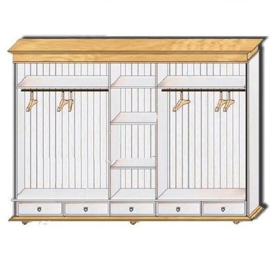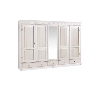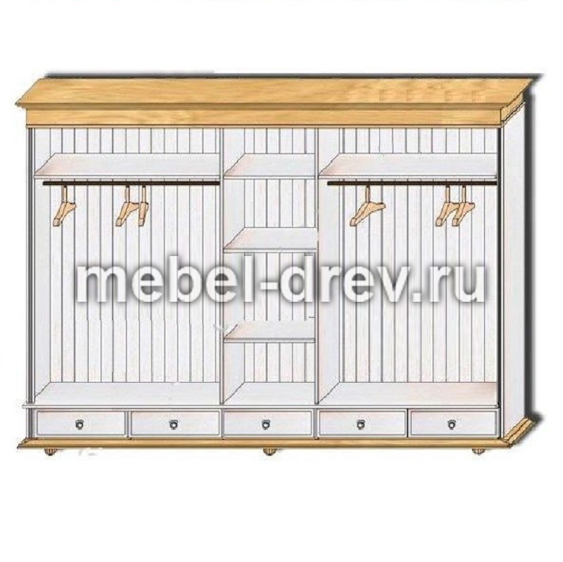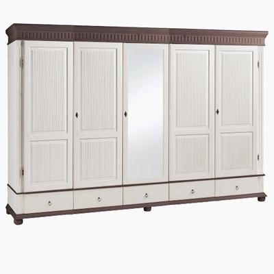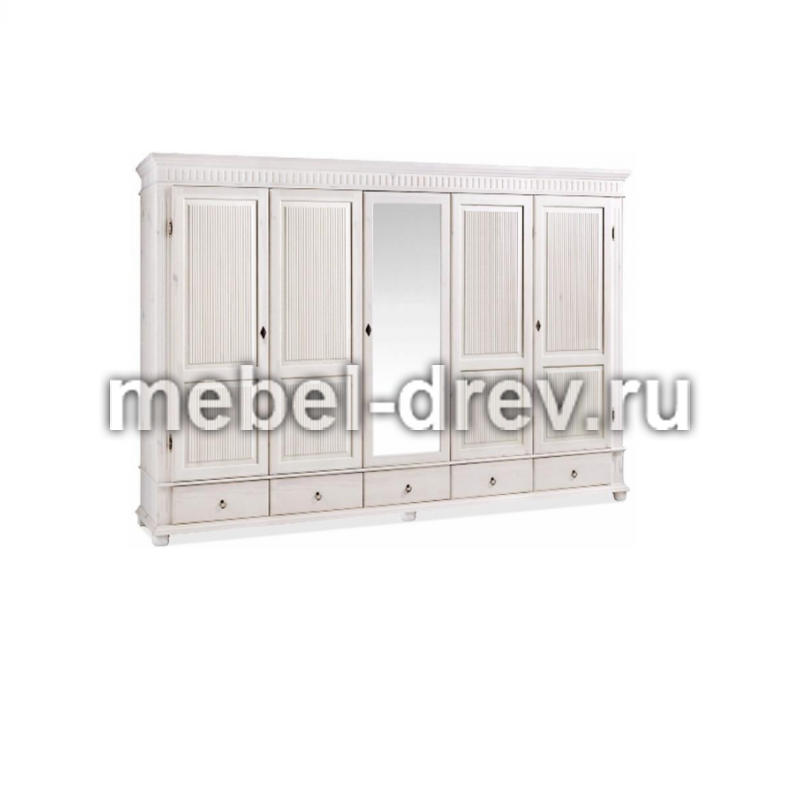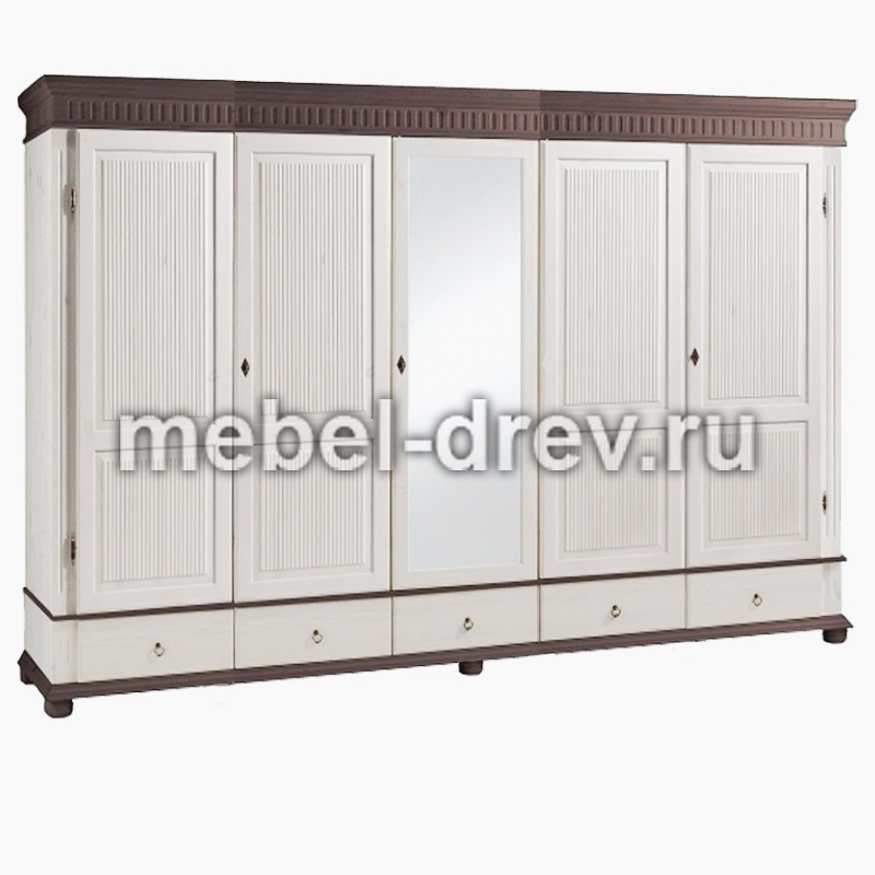 Пятидверный высокий распашной шкаф из массива сосны с зеркалом. Серия Мальта-Хельсинки производства белорусского завода ММЦ. Пять выдвижных ящиков на металлических направляющих. Двойное левое и правое отделение - платяные со штангой и одной полкой. Одинарное центральное отделение - бельевое, с полками. Задняя стенка шкафа - вагонка. Все двери деревянные с разделенной филенкой (рисунок дверец шкафа). С зеркалом на центральной дверце. Ручки-металлические.