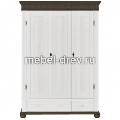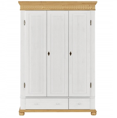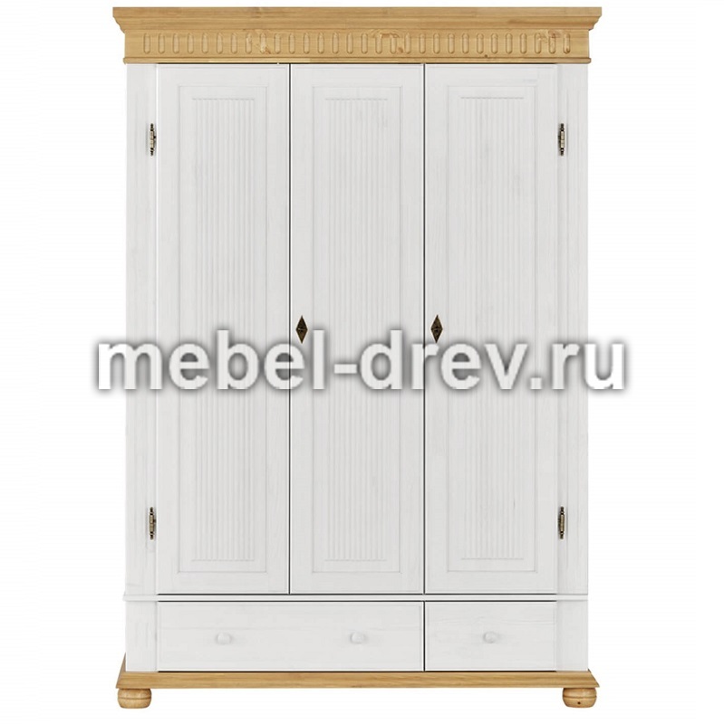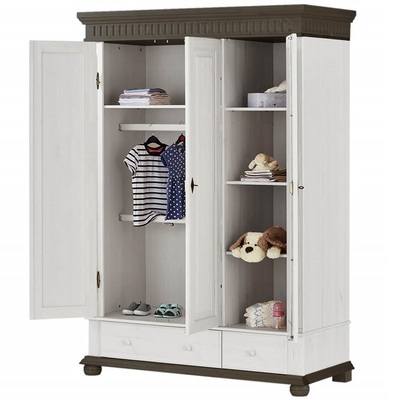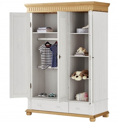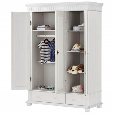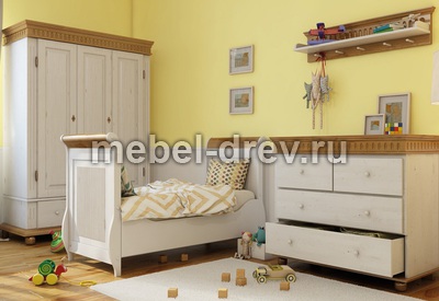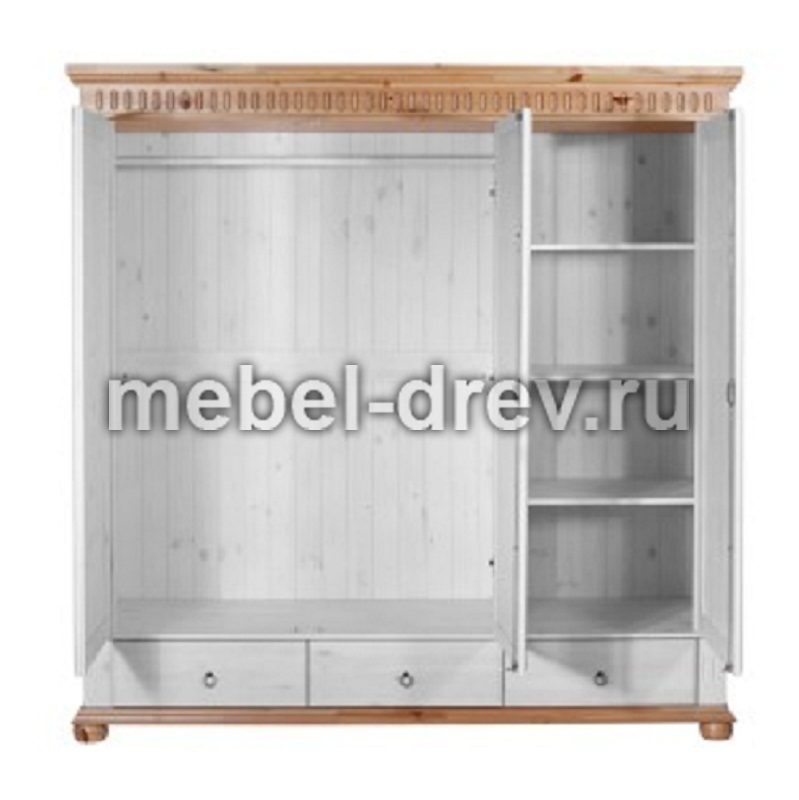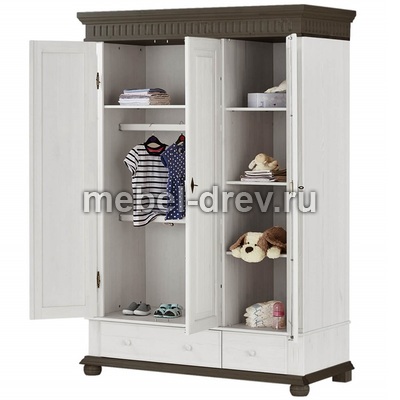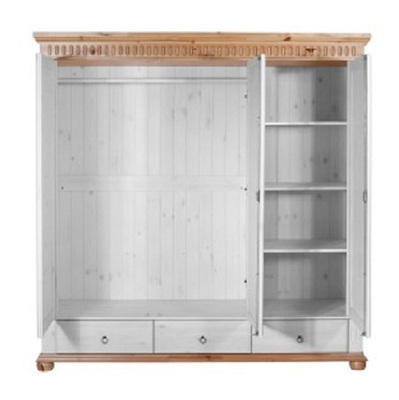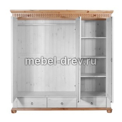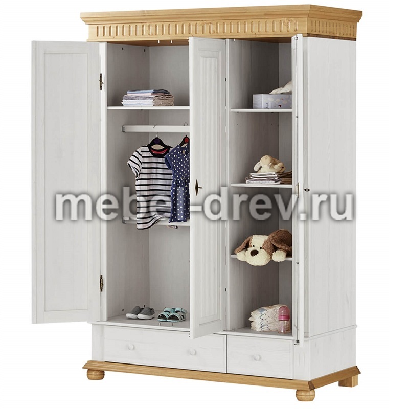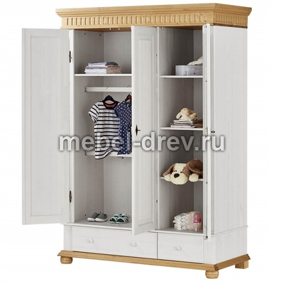 Распашной шкаф с выдвижным ящиком из массива сосны для детской комнаты. Серия Хельсинки производства белорусского завода ММЦ. Внутреннее наполнение: 1/3 шкафа-полки-3 шт., 2/3 шкафа-полка-1 шт. и штанга-2 шт. Сверху идет полочка, потом 2 штанги одна над другой.