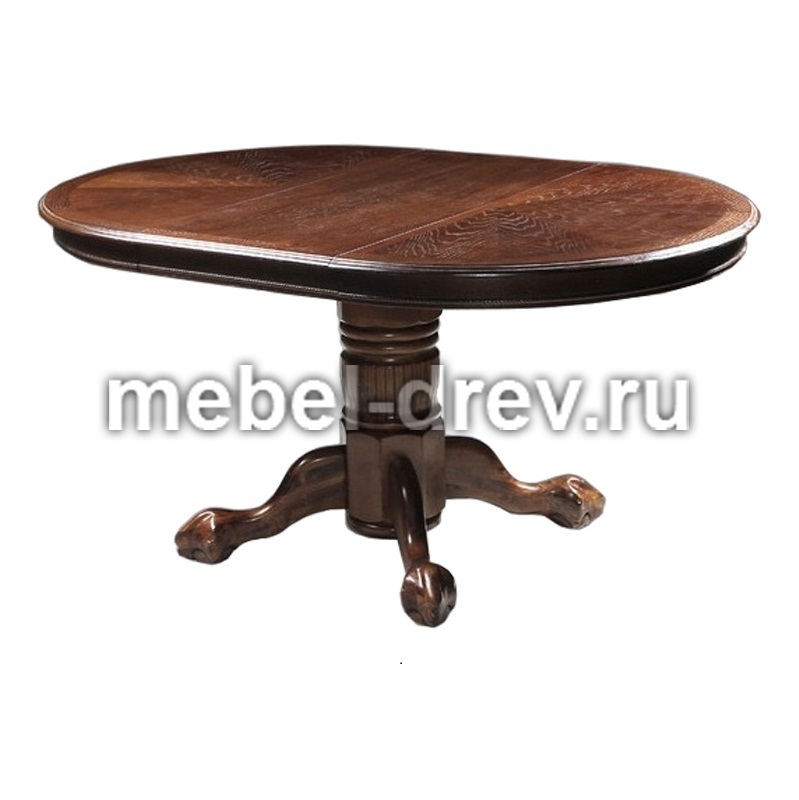 Надежный и красивый деревянный стол из массива малазийского дерева гевея. Львиная нога-массив гевеи, столешница-МДФ, шпонированная дубом. Отделано лаком. С помощью вставки 46 см раскладывается до 153 см.