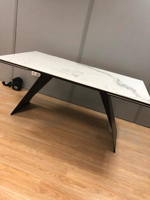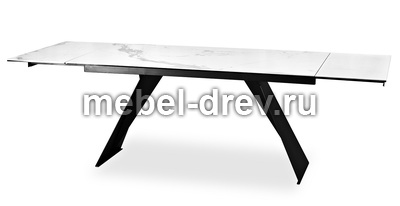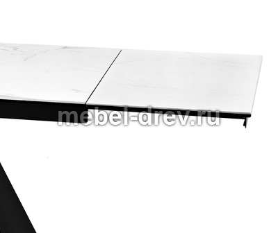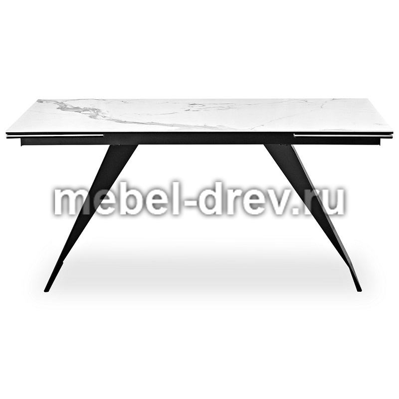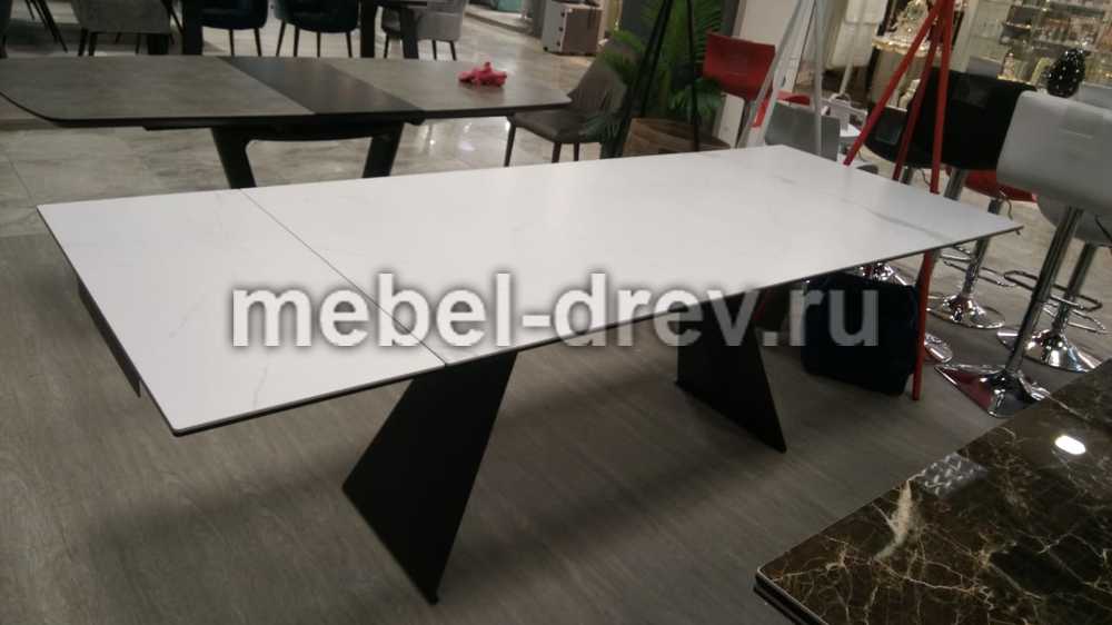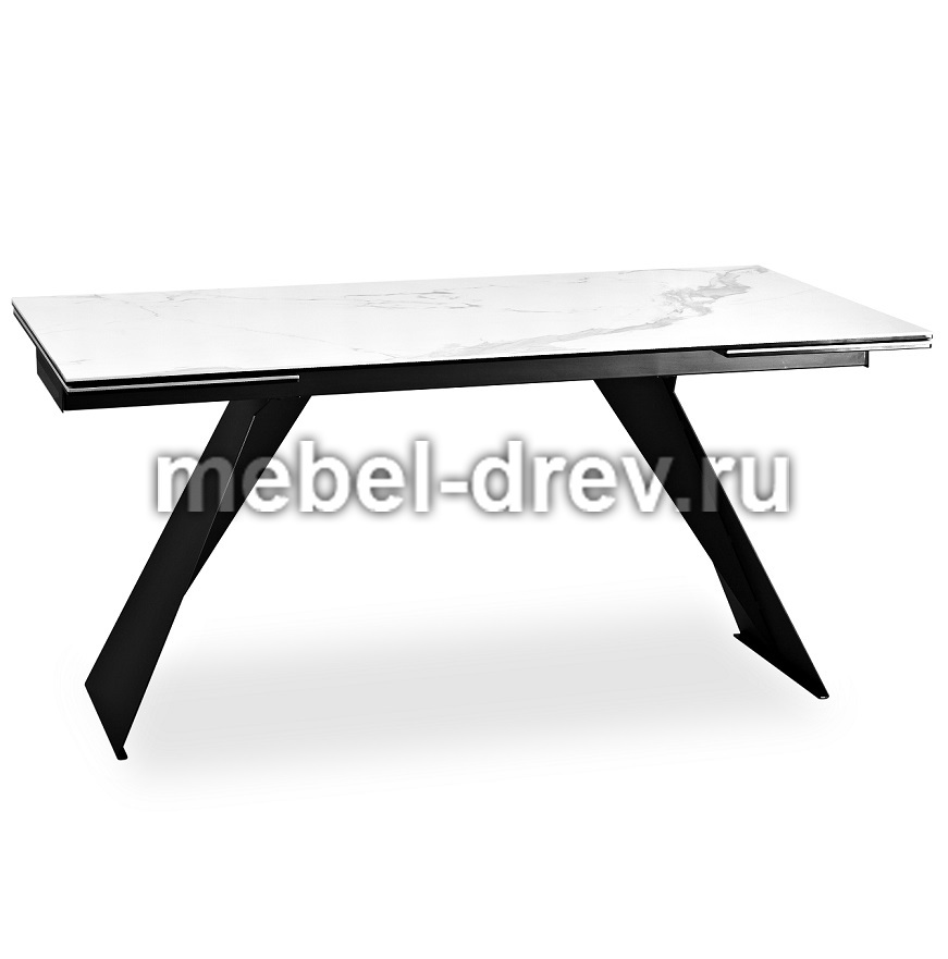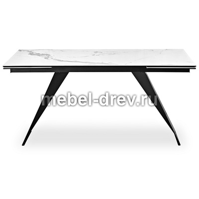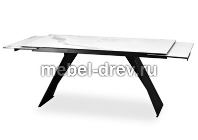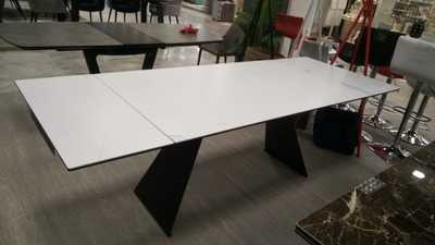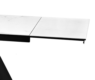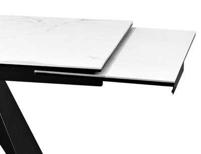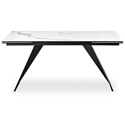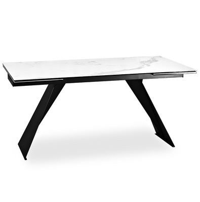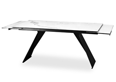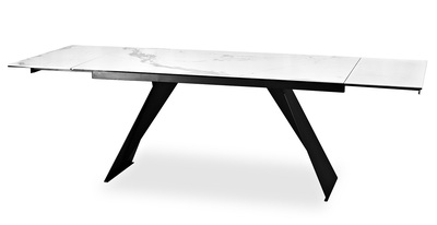 Ультрамодный раскладной стол Aris с керамической столешницей. Благодаря удобному механизму трансформации и вставкам по 40 см с двух сторон размер столешницы легко можно увеличить с 1,6 метров до внушительных 2,4 метров. Покрытие столешницы-керамика в цвете "белый мрамор", ножки и каркас сделаны из окрашенного в черный цвет металла. Фабрика Pranzo, Хорватия.