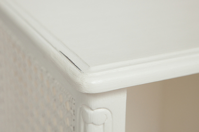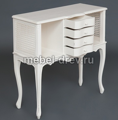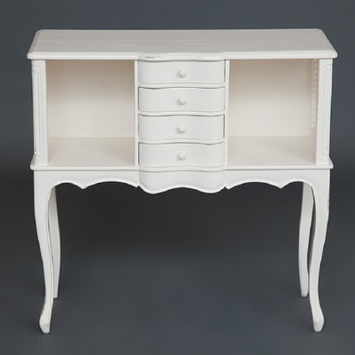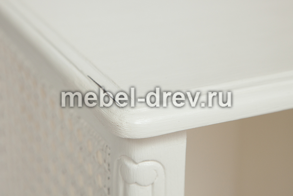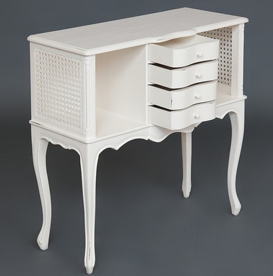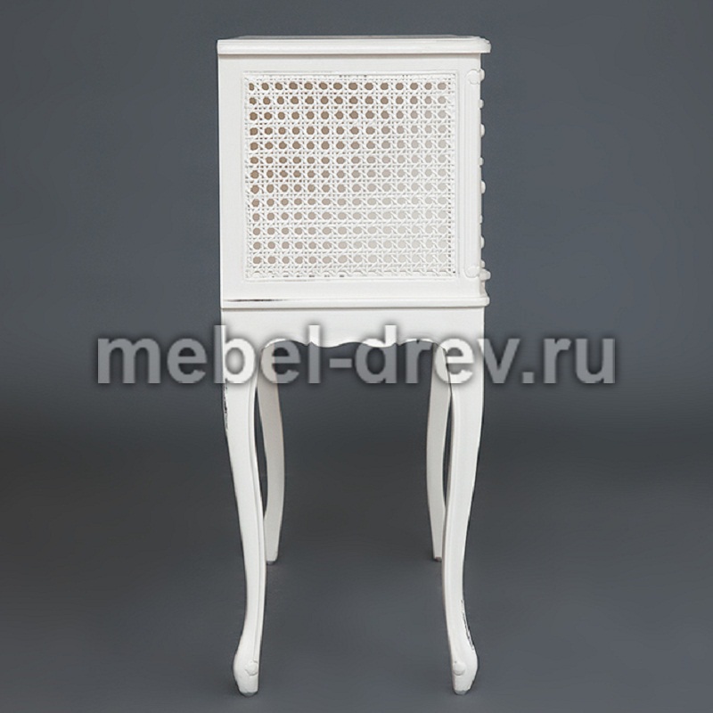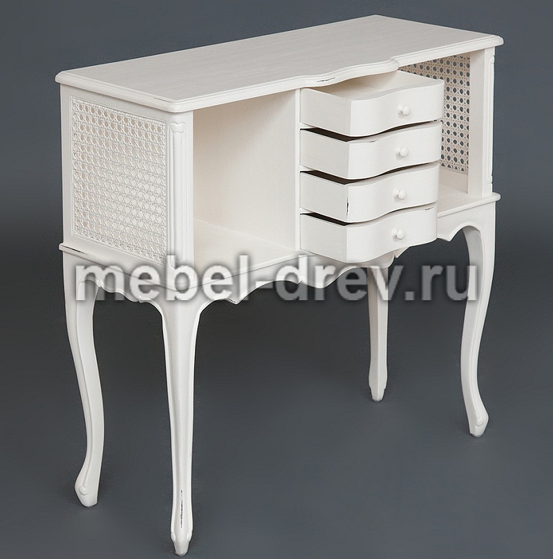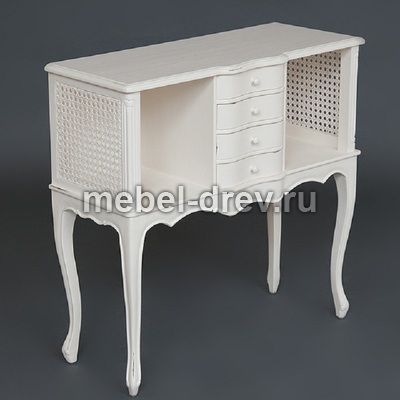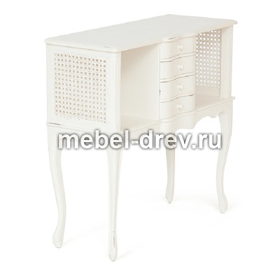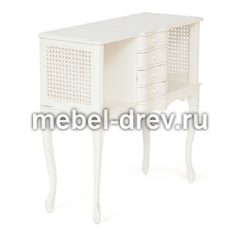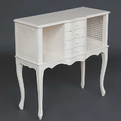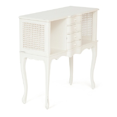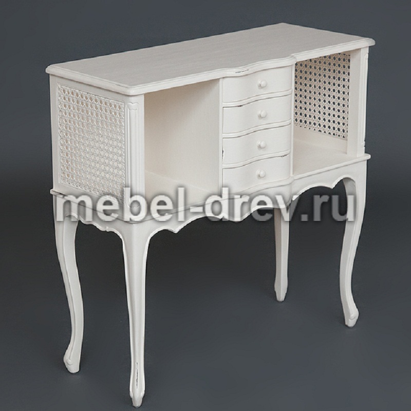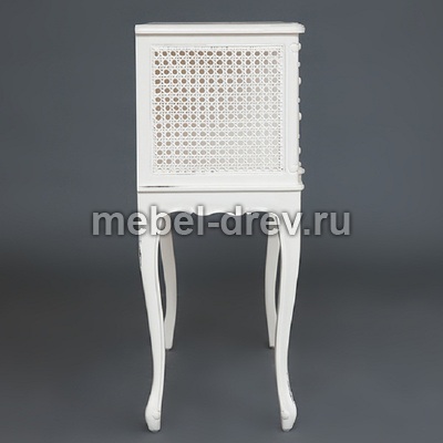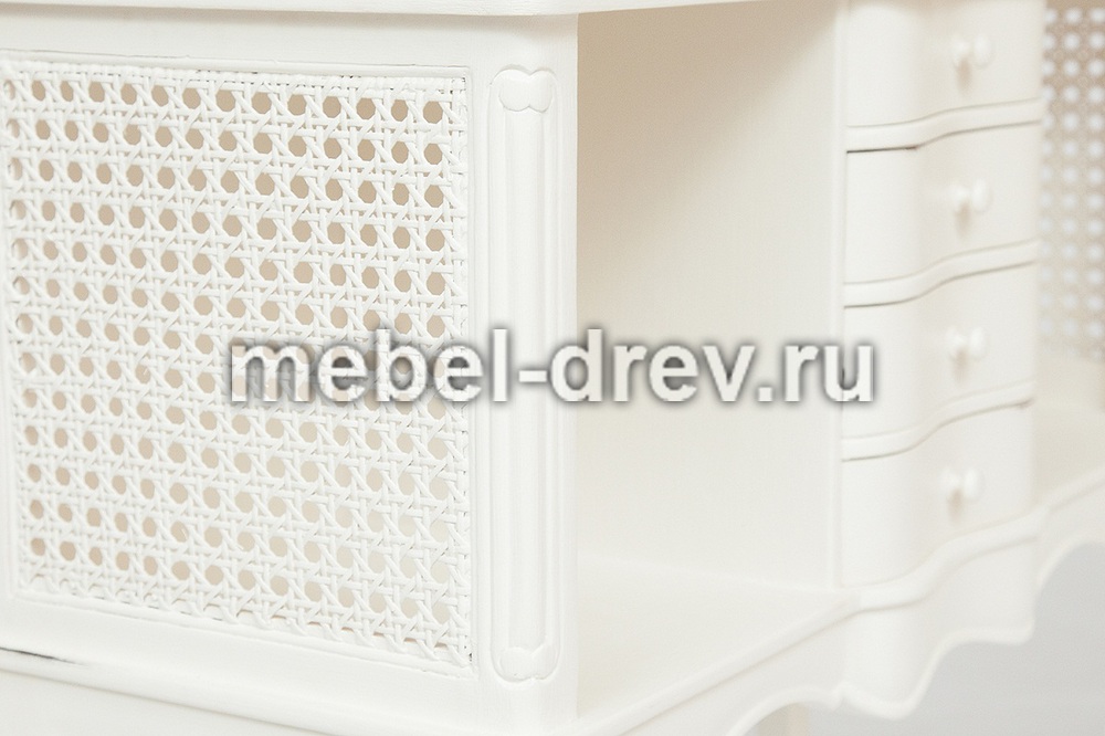 Небольшой элегантный комод с 4 выдвижными ящиками и боковыми нишами. Комод украшен изящной резьбой ручной работы, по бокам окрашенные вставки из ротанга. Натуральное дерево, окрашенное в светлые тона, сохраняет неповторимую фактуру и искусственные отпечатки времени в виде мелких трещин, потертостей, червоточин. Если вы хотите создать в собственном доме простую, теплую и вместе с тем изысканную обстановку, то стиль Прованс в этом случае подходит больше всего.