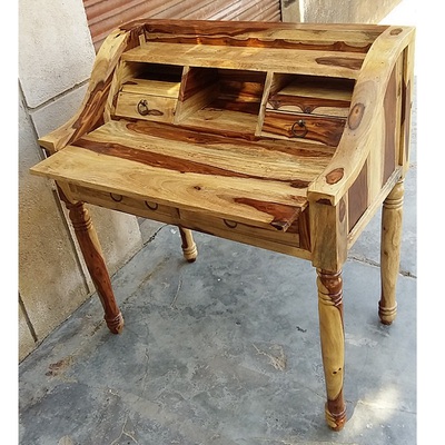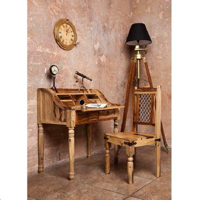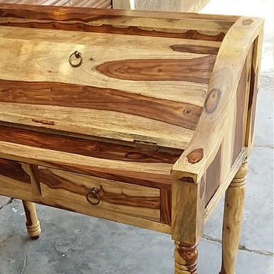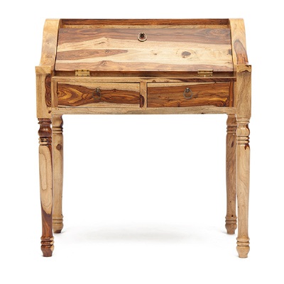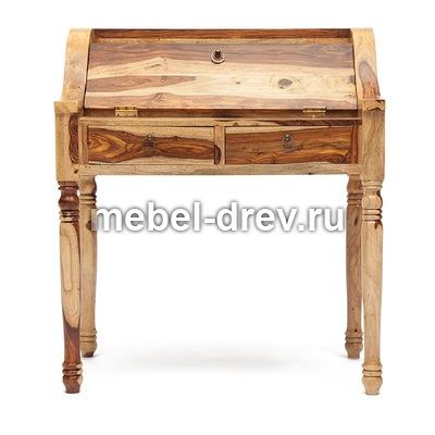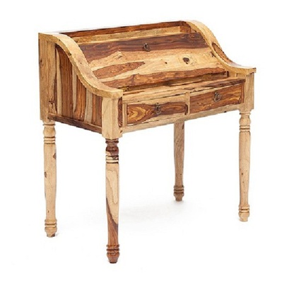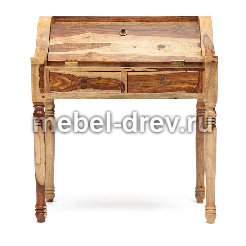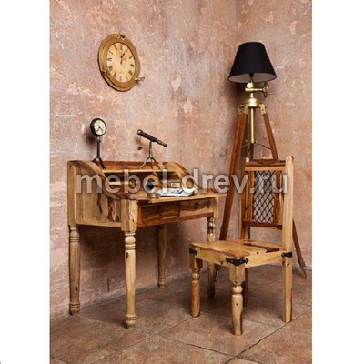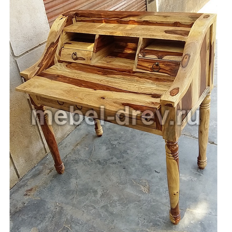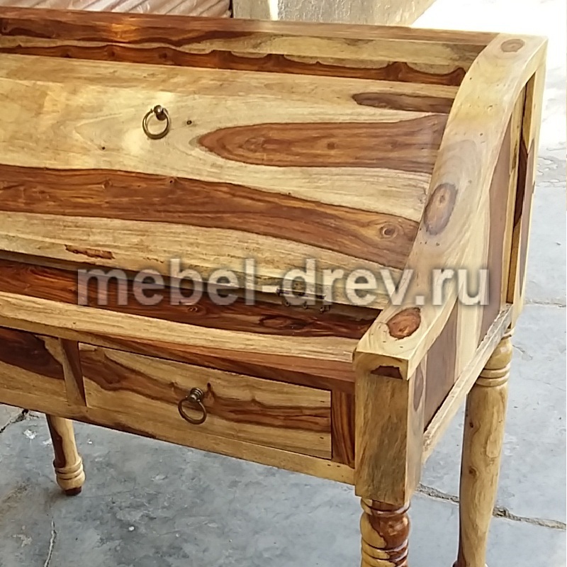 Стол-бюро с ящичками из натурального дерева, массива палисандра, отделка столика-железные заклепки. Массив палисандра-знаменитое розовое дерево Индии. Его уникальные качества-разнообразие текстуры, удивительная прочность и долговечность издавна привлекали мастеров для производства мебели. У стола несколько выдвижных ящиков для хранения и винтажная фурнитура из патинированной латуни. Все это в сочетании с пестрым этническим рисунком древесины создает неповторимую атмосферу далеких странствий и экзотических путешествий.