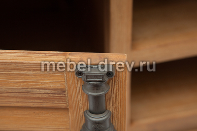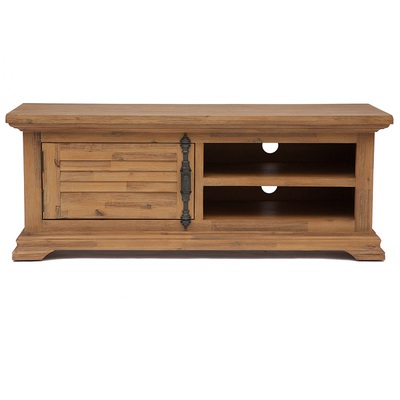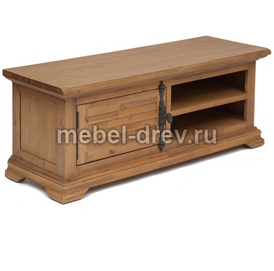Небольшая тумба под ТВ из натурального дерева, массива акации. У тумбы одно боковое отделение за дверцей, и открытые полочки справа. Изюминкой тумбы является запорный замок из металла в старинном стиле. А обработка поверхности тумбы подчеркивает стиль и красоту натурального дерева.