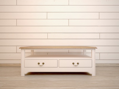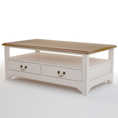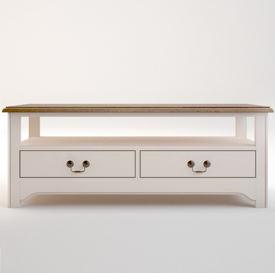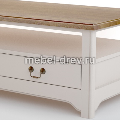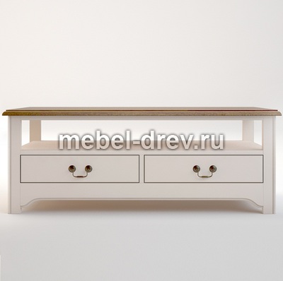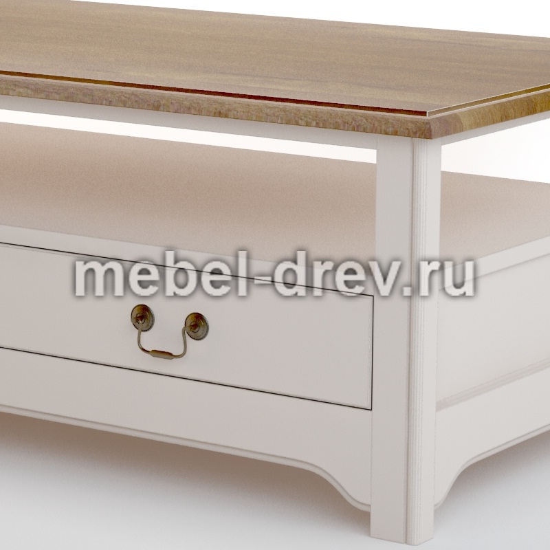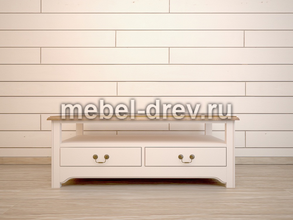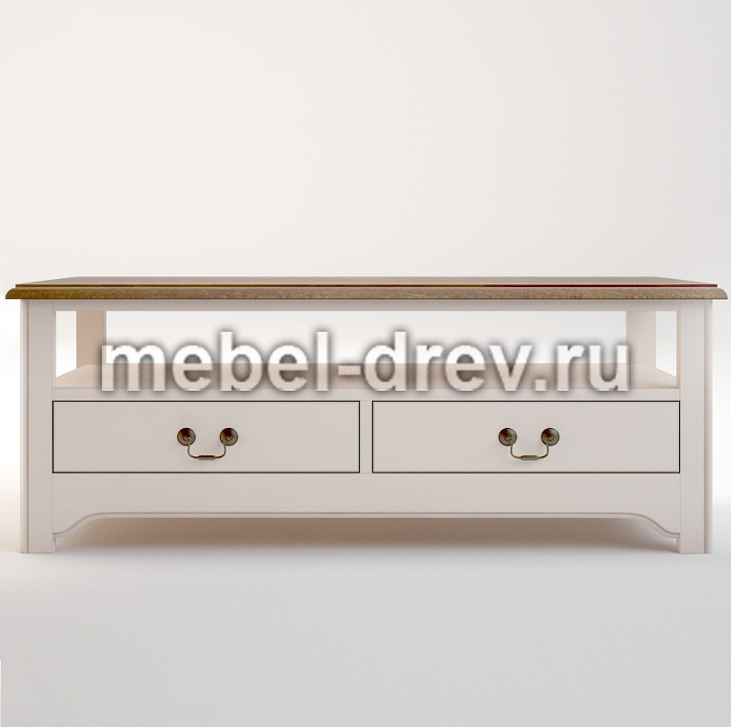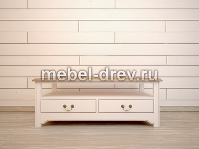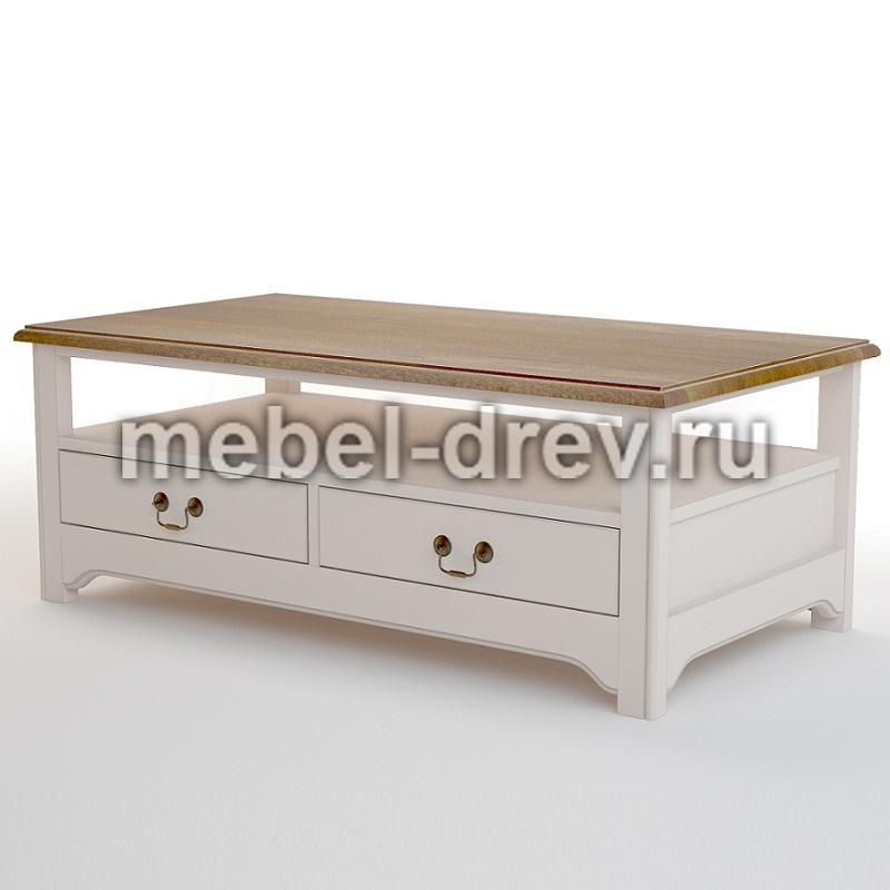 Стильный журнальный стол в строгом лаконичном дизайне, с подстольем и двумя выдвижными ящиками. Стол сделан из массива березы, в стиле Прованс, из коллекции мебели Оливия.