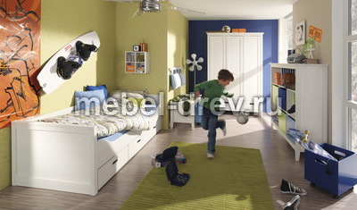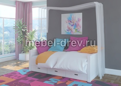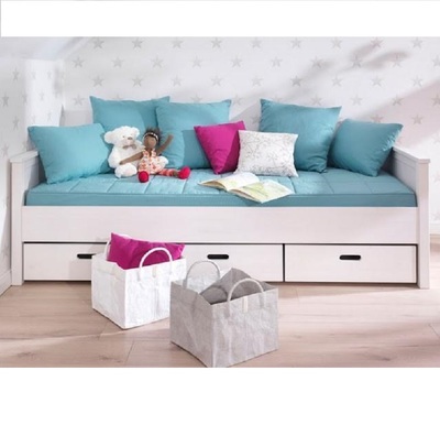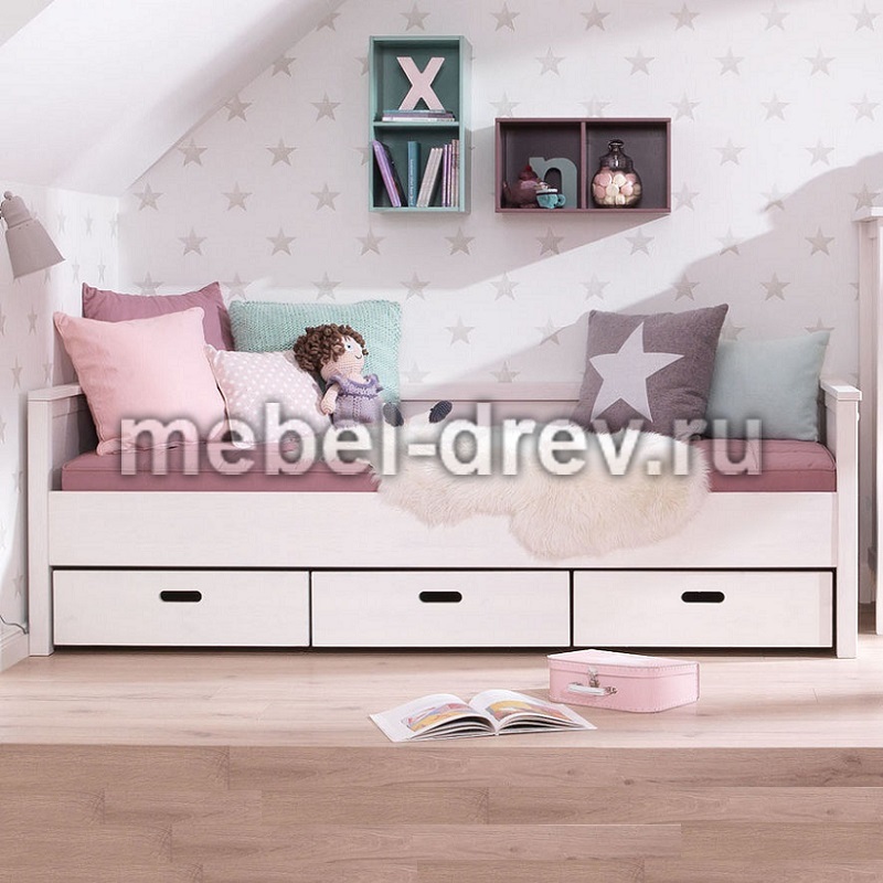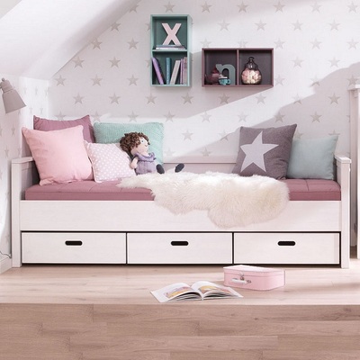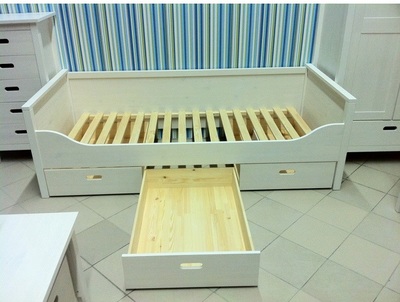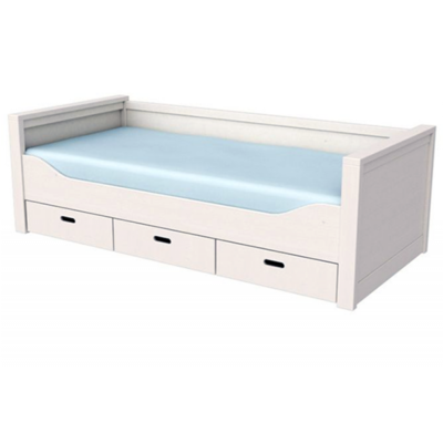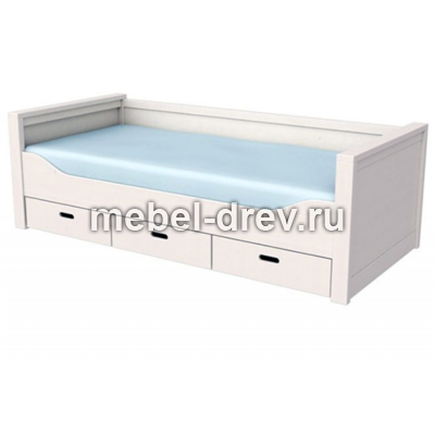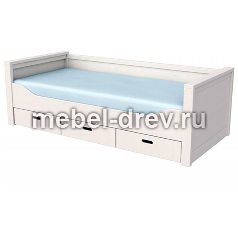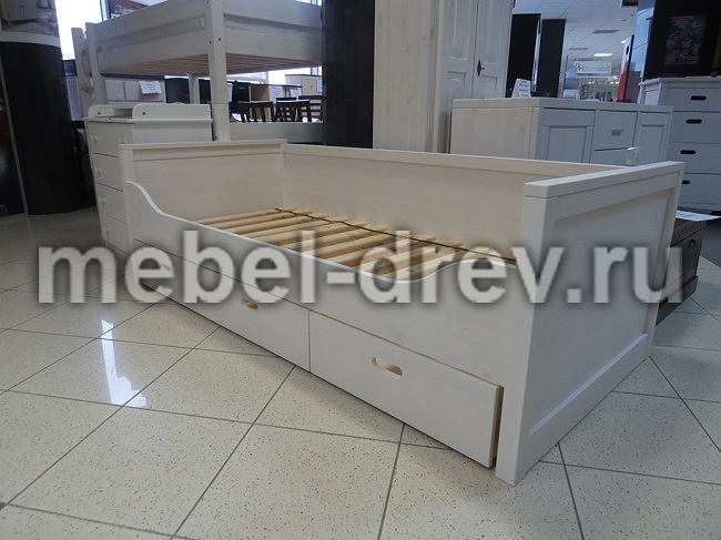 Диван-кровать Сиело от белорусского завода ММЦ. Изготовлен из массива сосны, с реечным основанием, покрыт экологически чистым и безопасным красителем на водной основе в цвете "белый воск". Диван односпальный, стандартного размера 90х200. Отлично подойдет для любой комнаты для взрослого, а также для детской комнаты. Для удобства размещения спальных принадлежностей диван оснащен выкатными ящиками на колесиках.