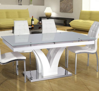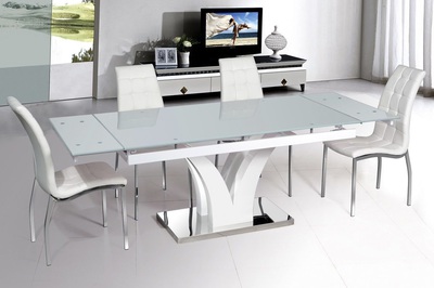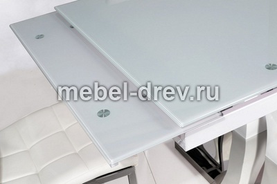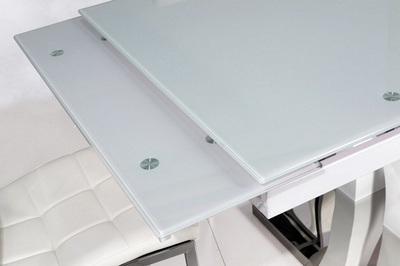 Современный стильный раскладной стол для кухни или гостиной. Стол сделан на каркасе из хромированного металла и оригинальной ножке из окрашенного металла, столешница-из закаленного стекла, стол надежен и удобен в использовании. Стол раскладной, с помощью вкладки 60 см под верхней столешницей раскладывается со 160 см до 220 см.