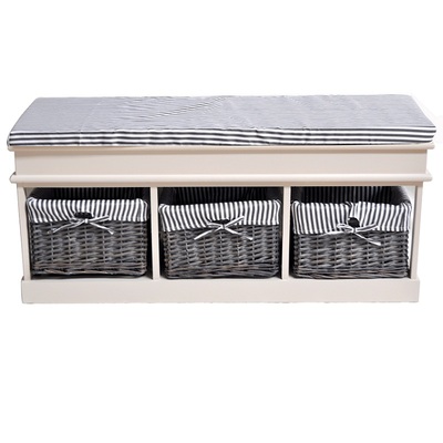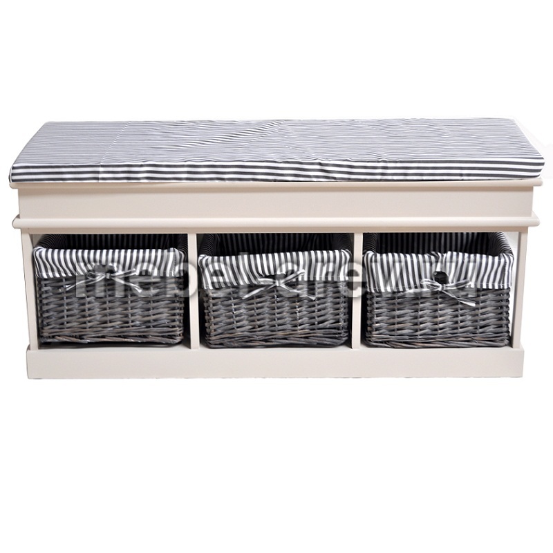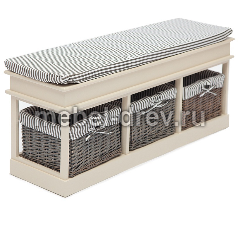 Обувница в стиле Прованс с 3 выдвижными корзинками из плетеной ивы и мягким сиденьем. Изготовлена из древесины дерева павловния, одного из самых легких видов древесины. Чехлы на корзинки съемные.