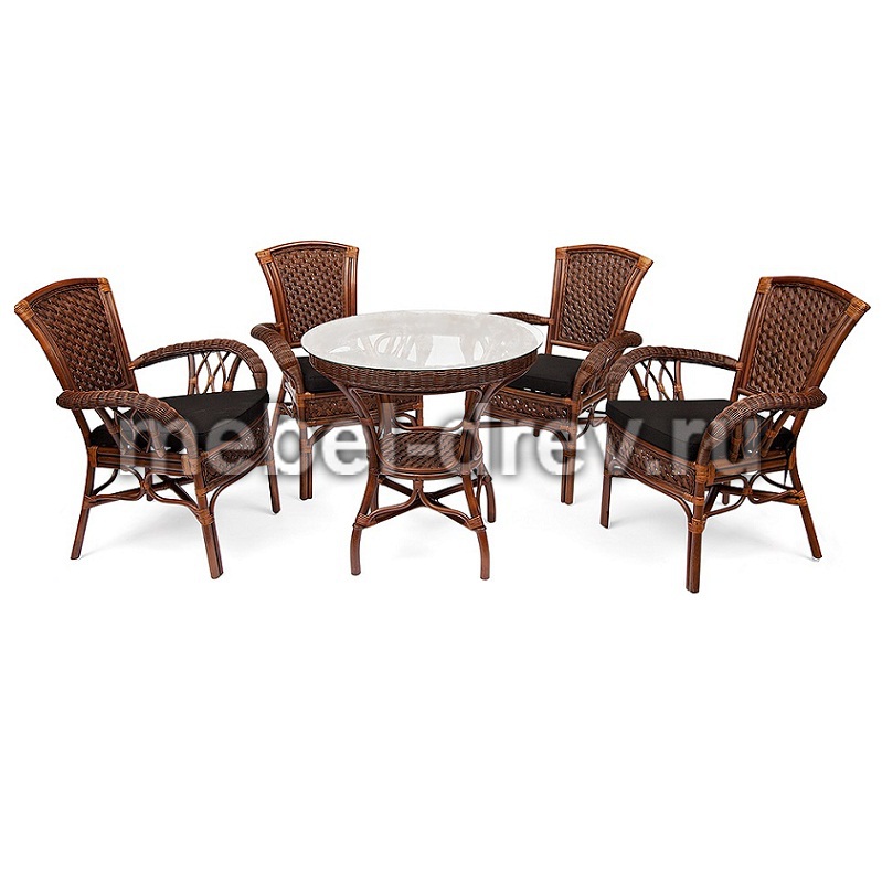 Обеденный комплект для кухни или гостиной Андреа изготовлен из прочного и гибкого ротанга. Натуральный ротанг может выдержать очень большой вес, при этом изделия из него очень легкие. Мебель из ротанга не рассыхается, не выцветает, влагоустойчива, пригодня для использования в бассейне, сауне, неотапливаемом помещении.