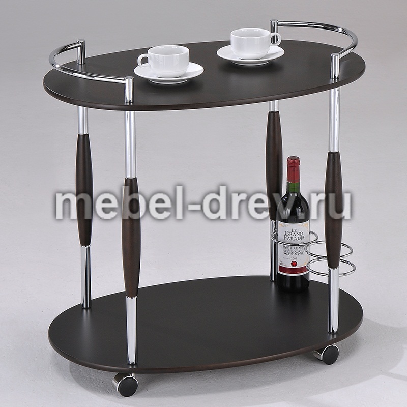 Удобный сервировочный столик на колесиках, с двумя столешницами и подставкой для бутылок. Корпус из металла с хромированным напылением, столешницы-МДФ.