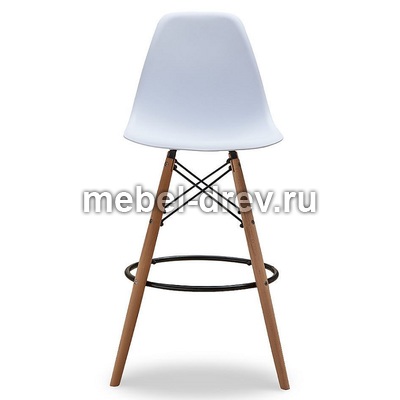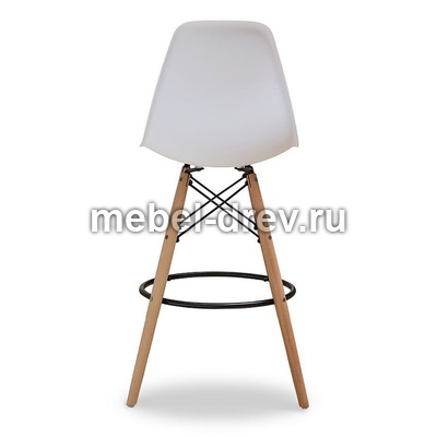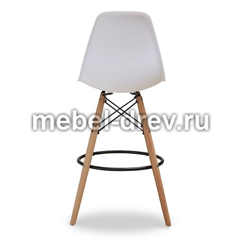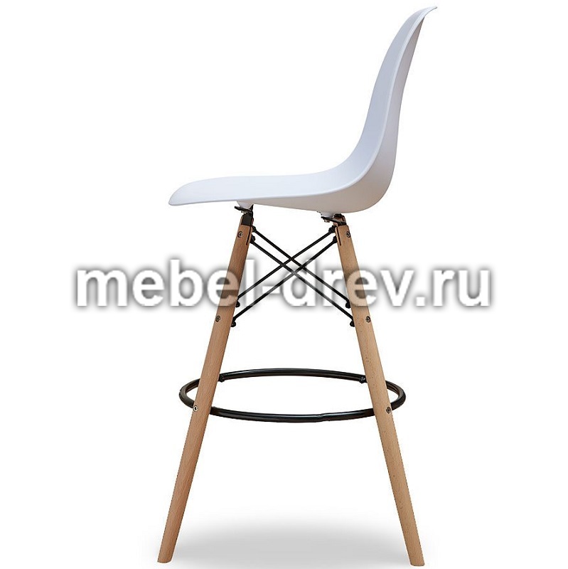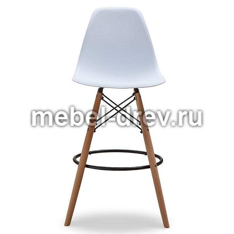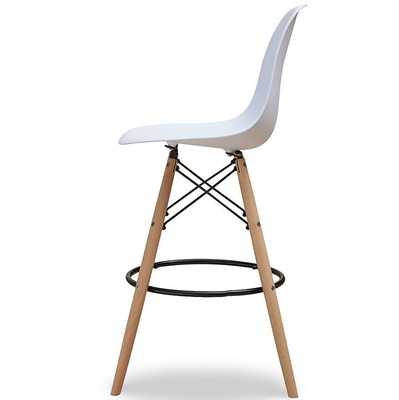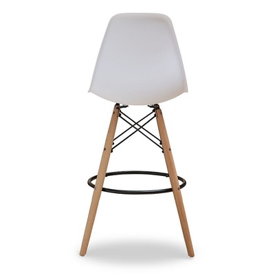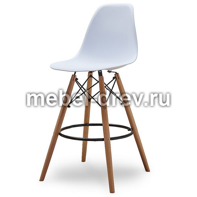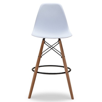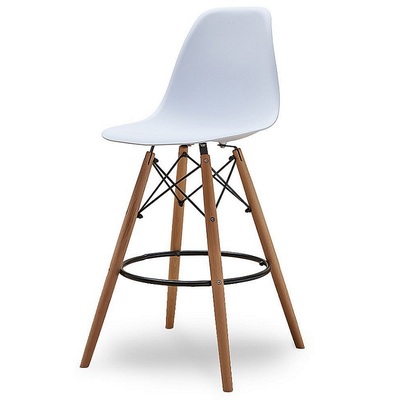 Современный дизайнерский барный стул. Ножки стула сделаны из бука, закреплены на металлических креплениях, сиденье и спинка из белого высококачественного пластика ABS. Стул надежен и удобен в уходе и использовании.