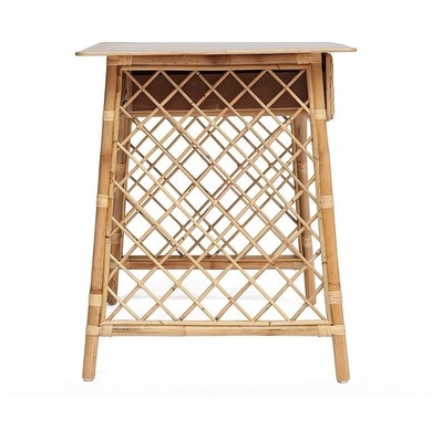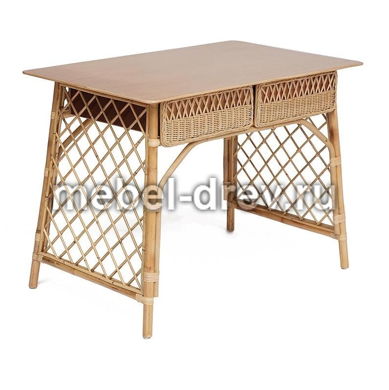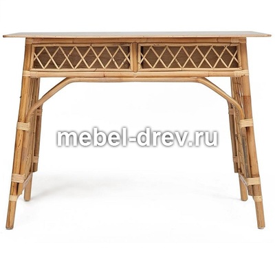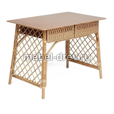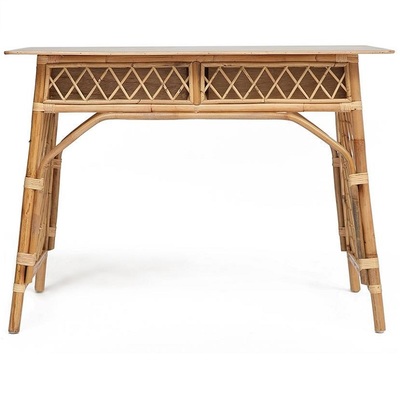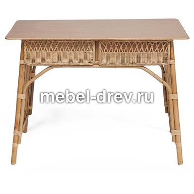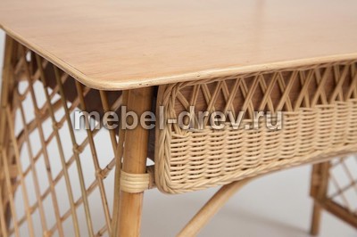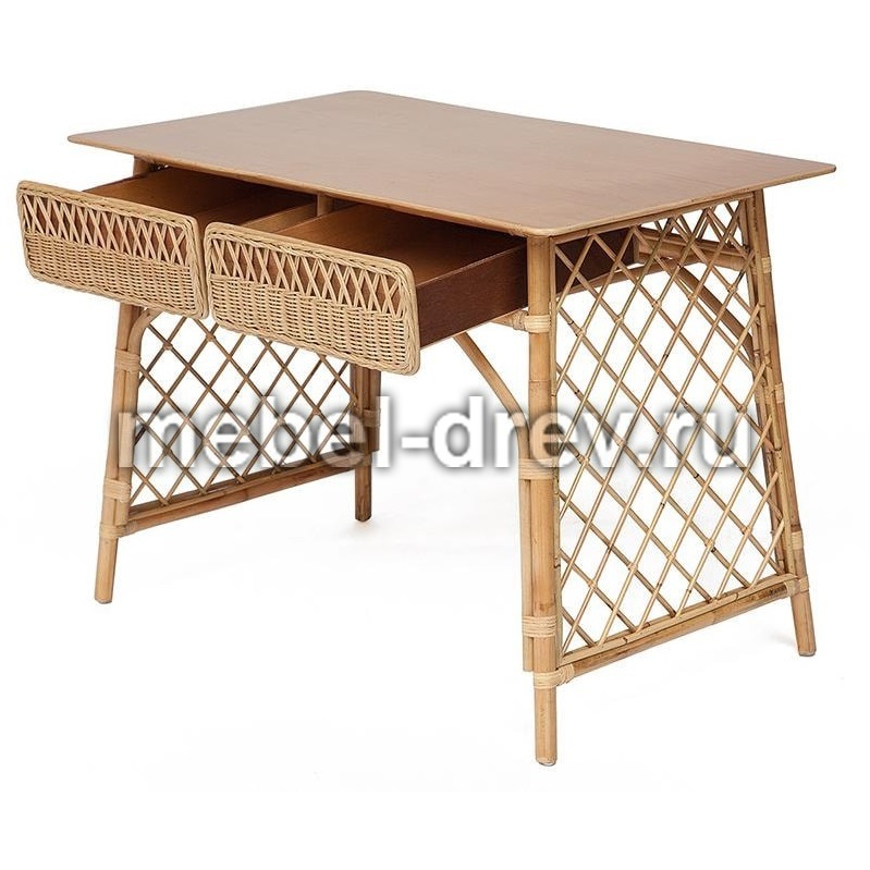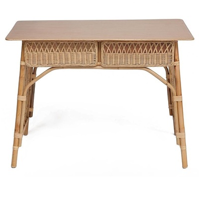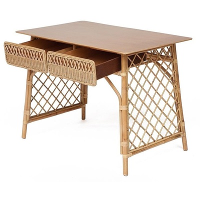 Удобный и функциональный стол Maison Objet для дачи. Стол сделан из натурального ротанга. Под столешницей из массива располагаются два больших выдвижных ящика. Их фасады декорированы ажурным плетением из ротанга. Прочность конструкции обеспечивают оригинальные боковые панели в виде классической садовой решетки. Ротанг не выцветает и не боится влаги и легко моется, поэтому его можно разместить в саду и на летней веранде.