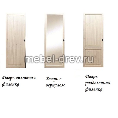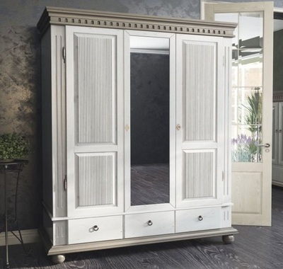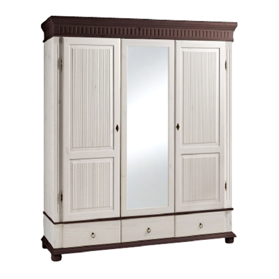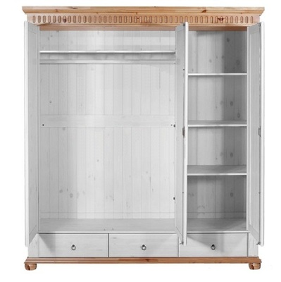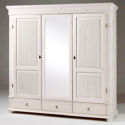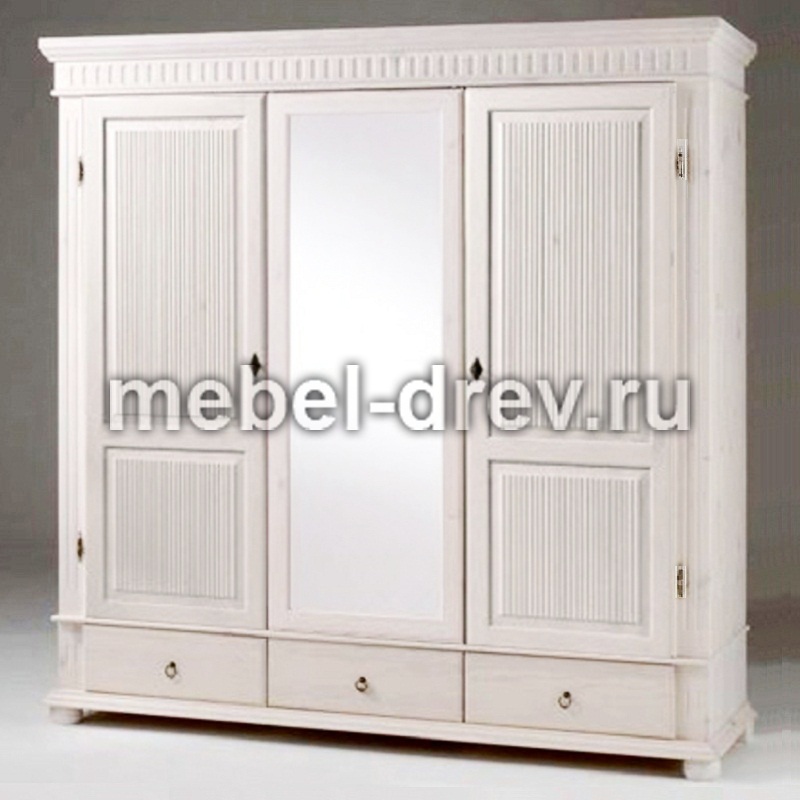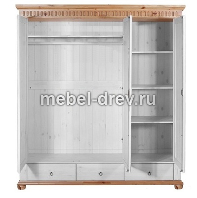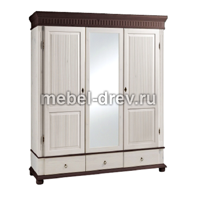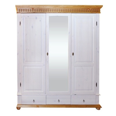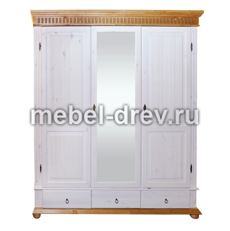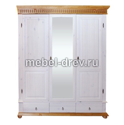 Трехстворчатый распашной шкаф с зеркалом, из массива сосны. Серия Мальта-Хельсинки производства белорусского завода ММЦ. Три выдвижных ящика на металлических направляющих. Комбинированный. Правое одинарное отделение с полками. Двойное левое отделение - бельевое, с штангой под платье. Задняя стенка шкафа - вагонка. Центральная дверь - зеркальная. Левая и правая двери деревянные с разделенной филенкой (рисунок дверец). Ручки-металлические.
