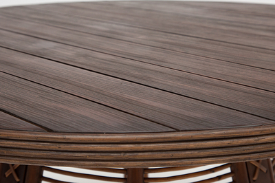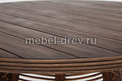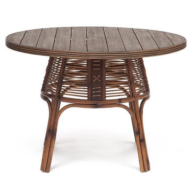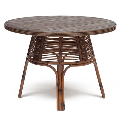 Обеденный стол со столешницей из натурального дерева. Стол на каркасе из ротанга, сверху плетеный натуральный ротанг. Ротанг используется для летнего отдыха, открытых веранд и кафе, а также дизайна загородного дома. Мебель из ротанга служит много лет подряд, не портится и не выцветает.