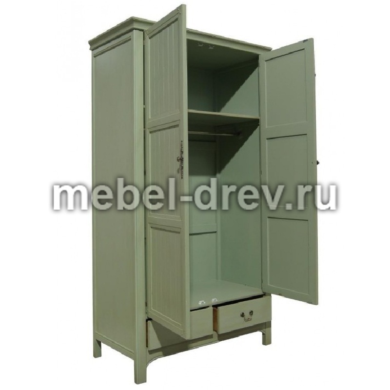 Двустворчатый платяной шкаф с распашными дверцами строгих лаконичных форм. Изготовлен из массива березы, в стиле Прованс, из коллекции мебели Оливия. У шкафа два больших выдвижных ящика и просторная шляпная полка (можно крепить выше).