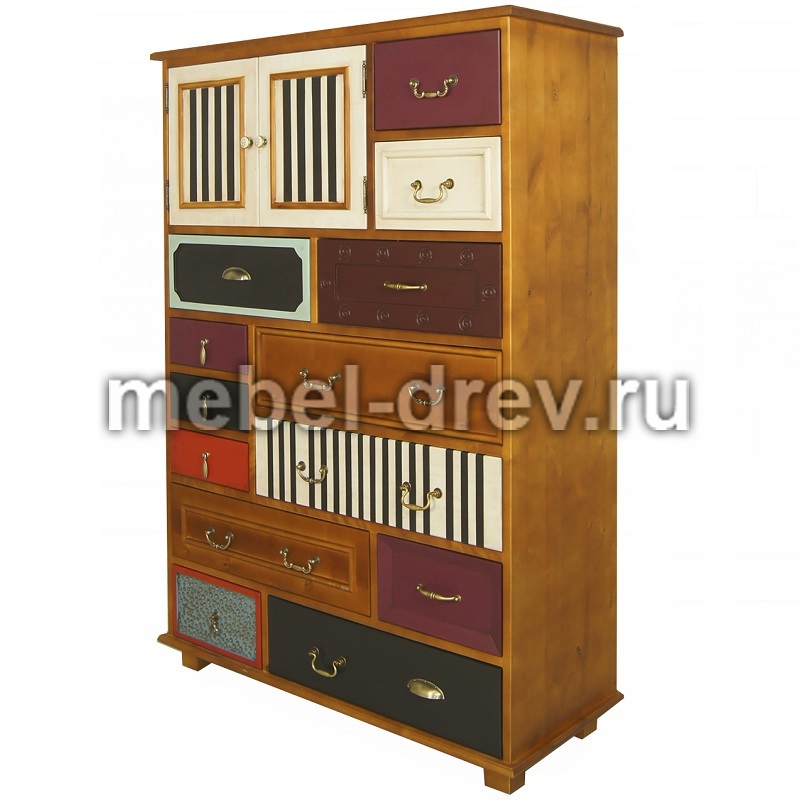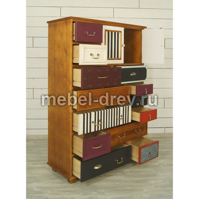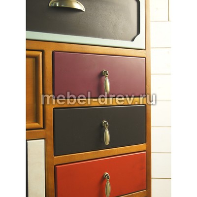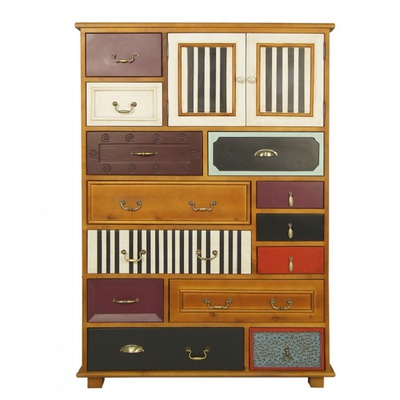 Высокий комод с множеством веселых разноцветных ящиков. Забавная раскраска этого комода внесет долю позитива в ваш интерьер и сделает его необычным. Дизайн комода в стиле Поп-арт, по проекту бельгийских дизайнеров. Сделан из массива березы, с искусственно состаренными поверхностями. У комода 13 выдвижных ящиков разного размера, с разным окрасом и разной фурнитурой.
