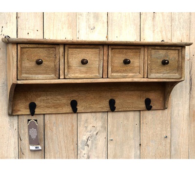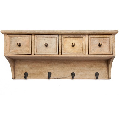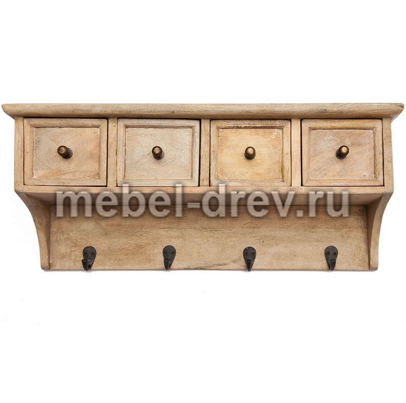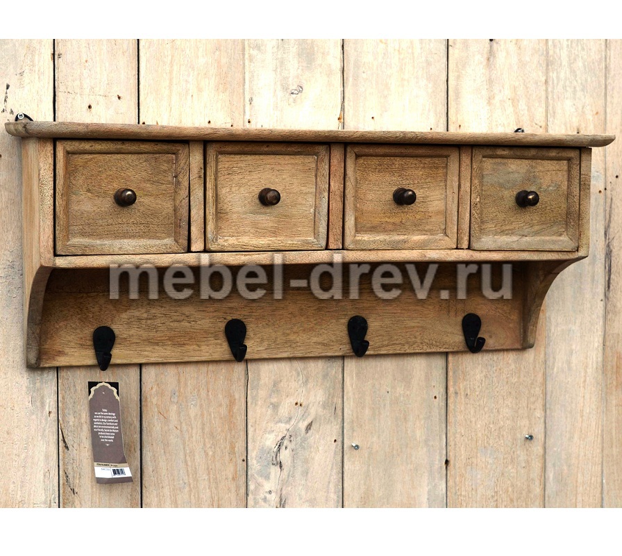 Настенная полка Pigalle (Пигаль) в модном стиле Лофт. Изготовлено из необычной древесины дерева манго, с искусственно состаренной поверхностью. У полочки 4 выдвижных ящика и 4 крючка для полотенец и кухонных принадлежностей.
