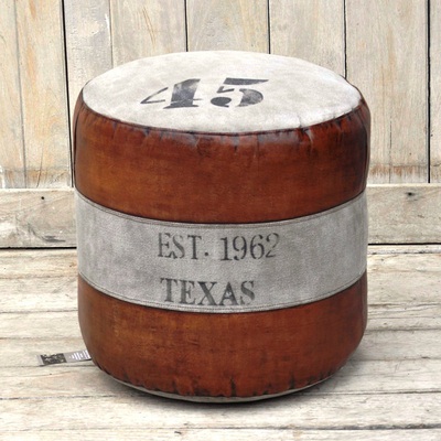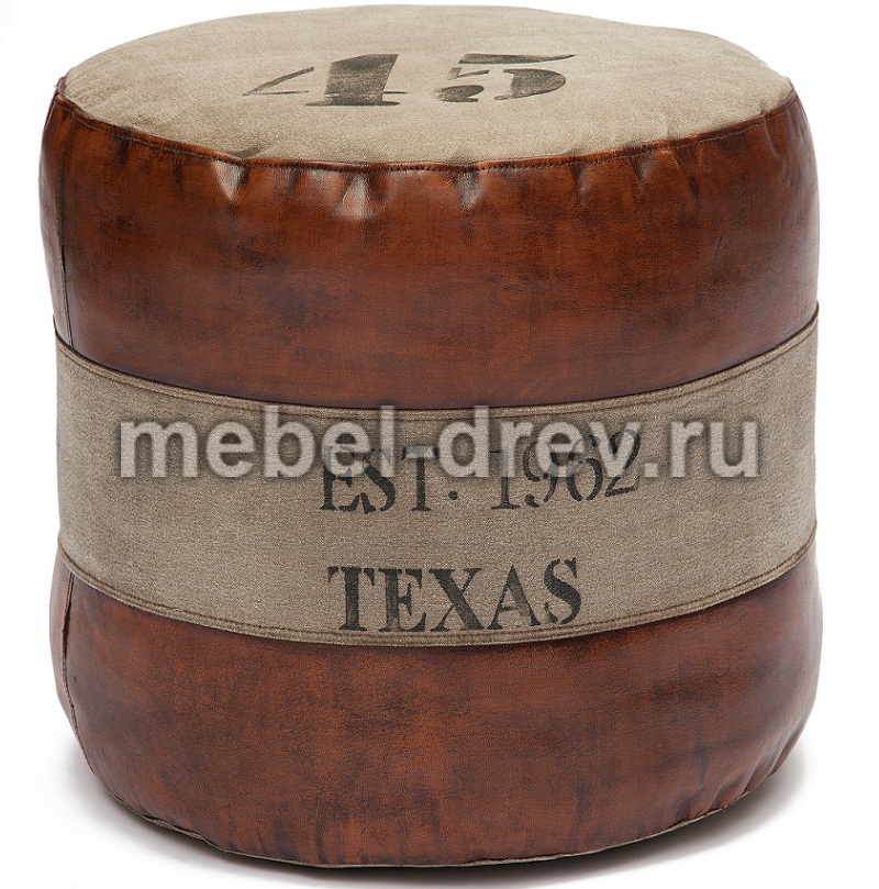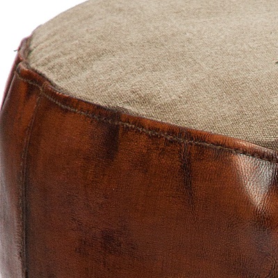 Круглый пуф М-8030 Texas в модном стиле Лофт. Обит хлопковой тканью Винтаж, с чередованием полос натуральной кожи буйвола, с прострочкой и декоративной отделкой.
