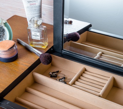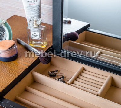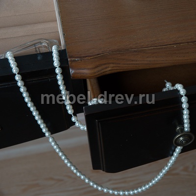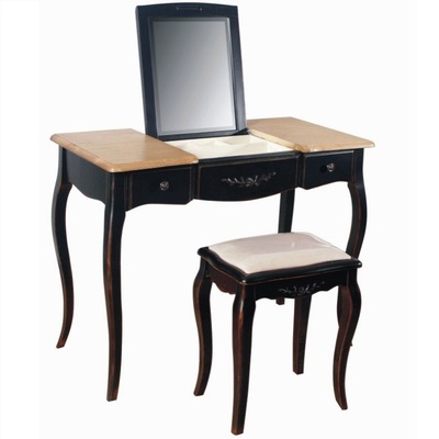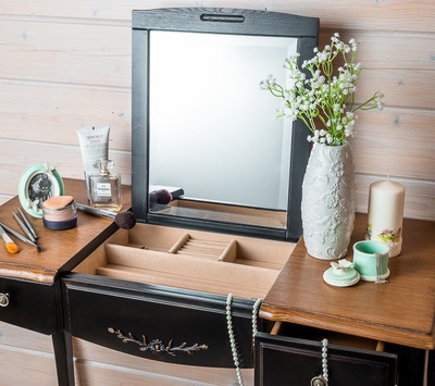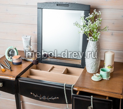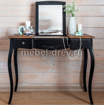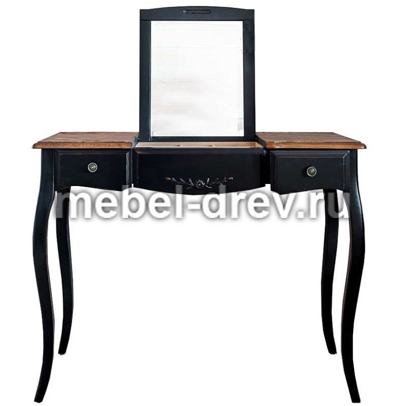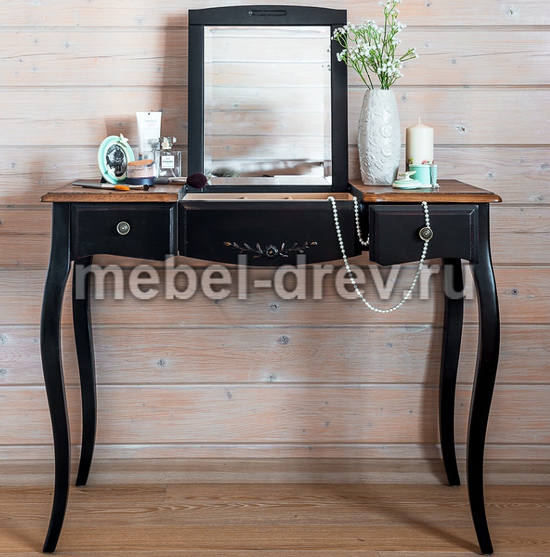 Туалетный столик в стиле Прованс из коллекции Belveder (Бельведер). Сделан из массива березы, с выдвижными ящичками, в оригинальном черном цвете, с искусственно состаренной поверхностью столика. У столика открывается столешница, под которой находится откидное зеркало. Также под откидным зеркалом много отделений для женских мелочей.