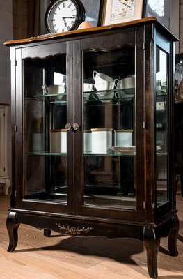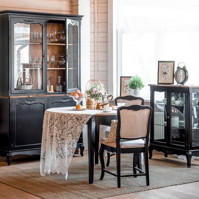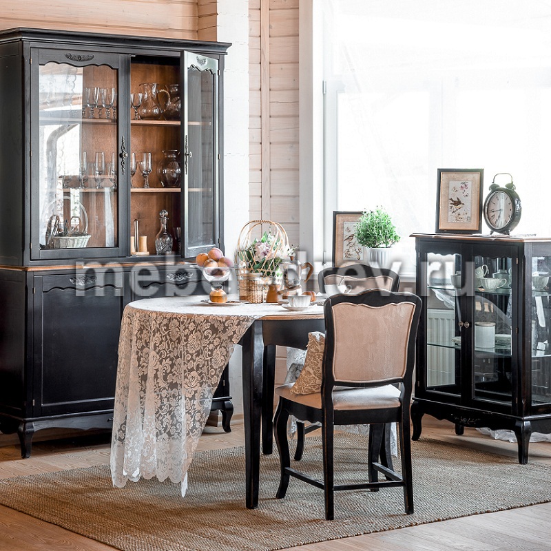 Невысокая витрина в стиле Прованс из коллекции Belveder (Бельведер). Изготовлена из массива березы, в оригинальном черном цвете, с верхом (топом) контрастного цвета, с искусственно состаренной поверхностью. Отличная мебель из массива березы будет радовать вас долгие годы.
