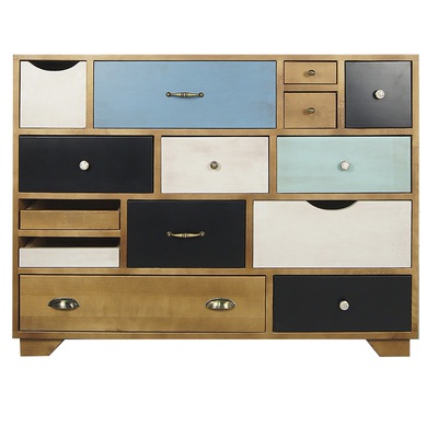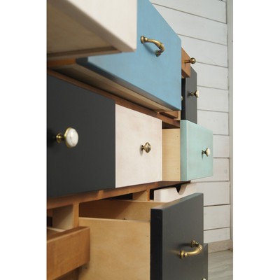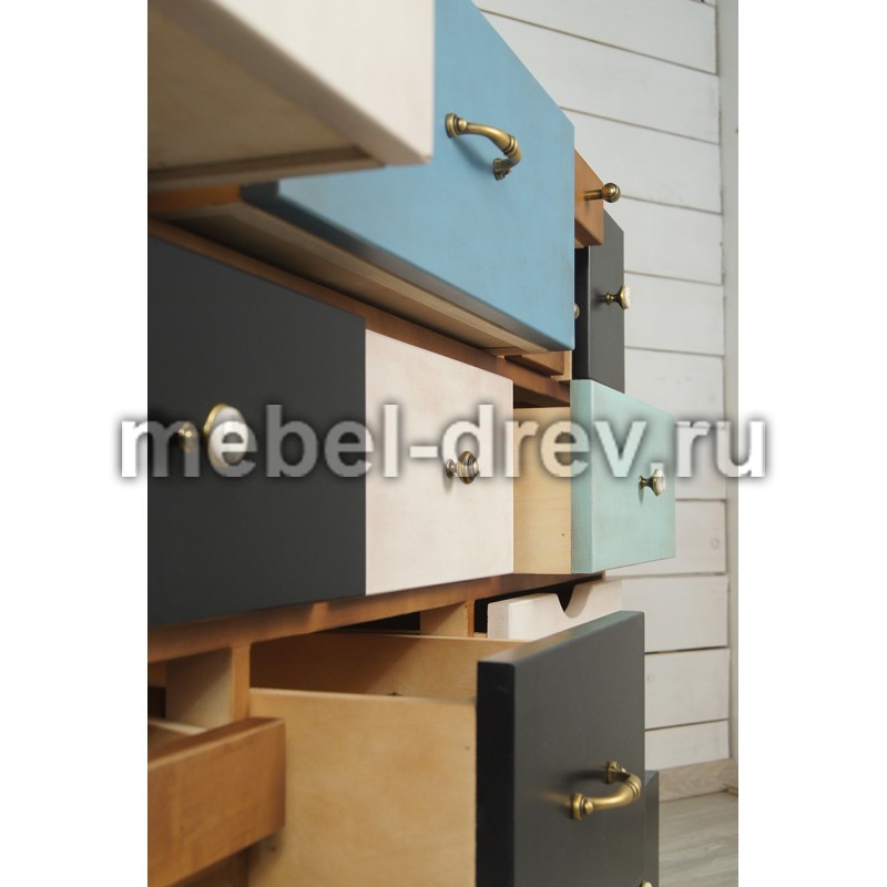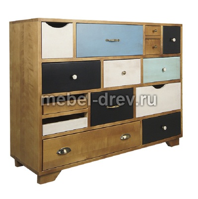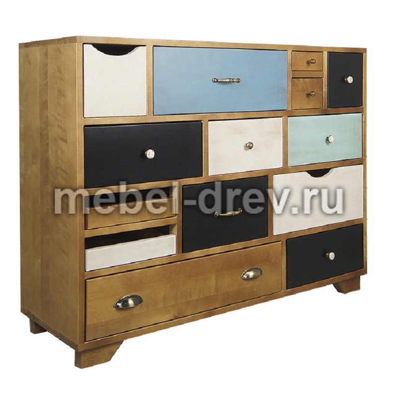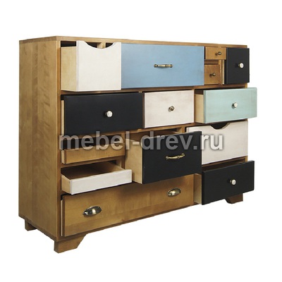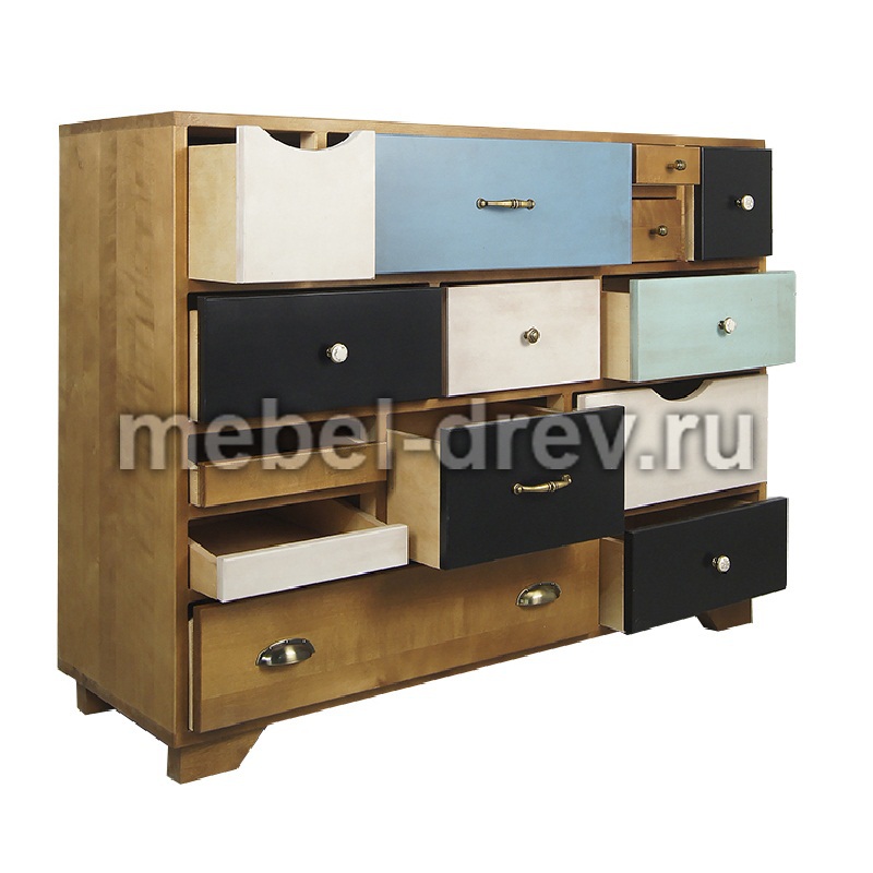 Необычный дизайнерский комод Aquarelle (Акварель). Комод подходит как яркий акцент для любого помещения. Забавная раскраска фасадов комода внесет долю позитива в ваш интерьер и сделает его необычным. Дизайн комода по проекту бельгийских дизайнеров, в стиле Поп-арт. Сделан из массива березы, с 14 выдвижными ящиками разного размера, разного окраса и с разной фурнитурой.