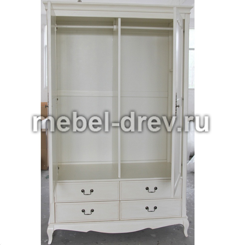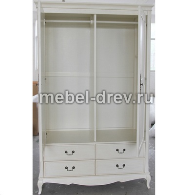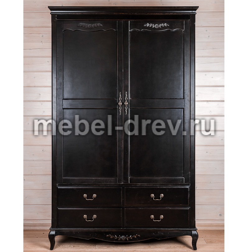 Двустворчатый платяной шкаф, в стиле Прованс из коллекции Belveder (Бельведер). Изготовлено из массива березы, в оригинальном черном цвете, с искусственно состаренной поверхностью. Внутреннее наполнение шкафа-2 вешалки и 4 выдвижных ящика для белья внизу.