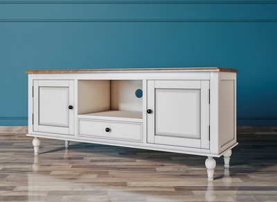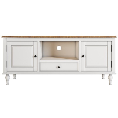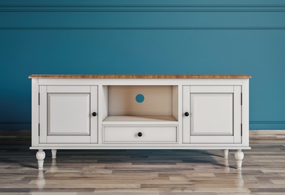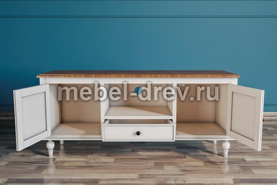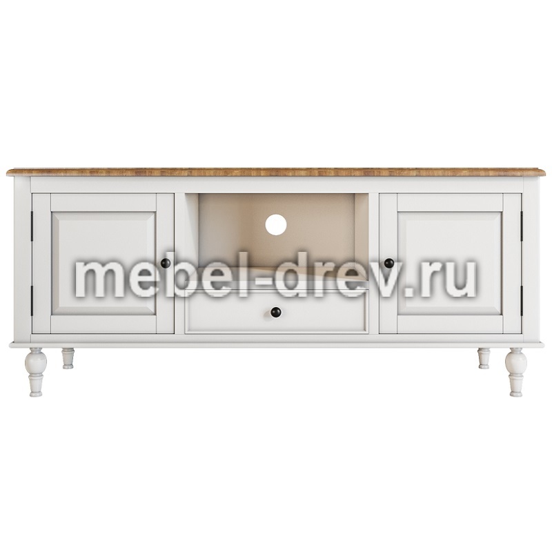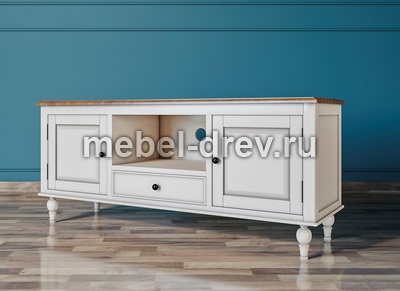 Комод под ТВ Одри в стиле Прованс. Изготовлен из массива березы и массива ясеня. Большие боковые ниши с двух сторон комода позволяют разместить нужные для ТВ вещи, выдвижной ящик и широкая полочка отлично подходят для размещения аппаратуры, игровых приставок и прочего. Строгий стиль и элегантность изделия подчеркивает белый цвет, резные ножки, а также контрастная по цвету столешница в цвете орех.