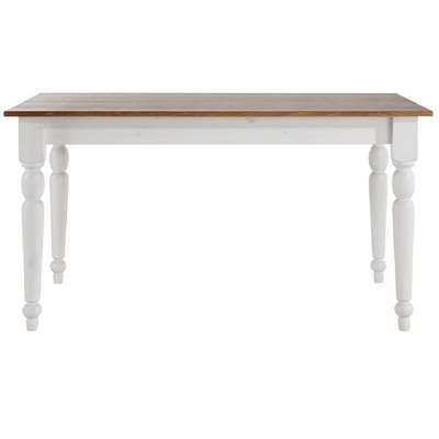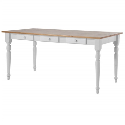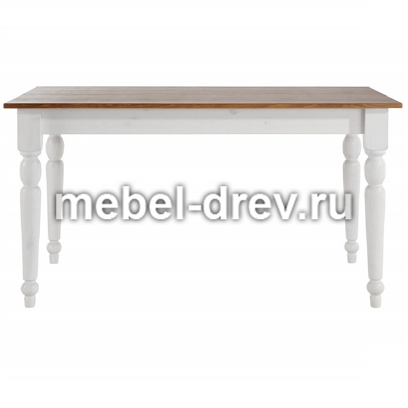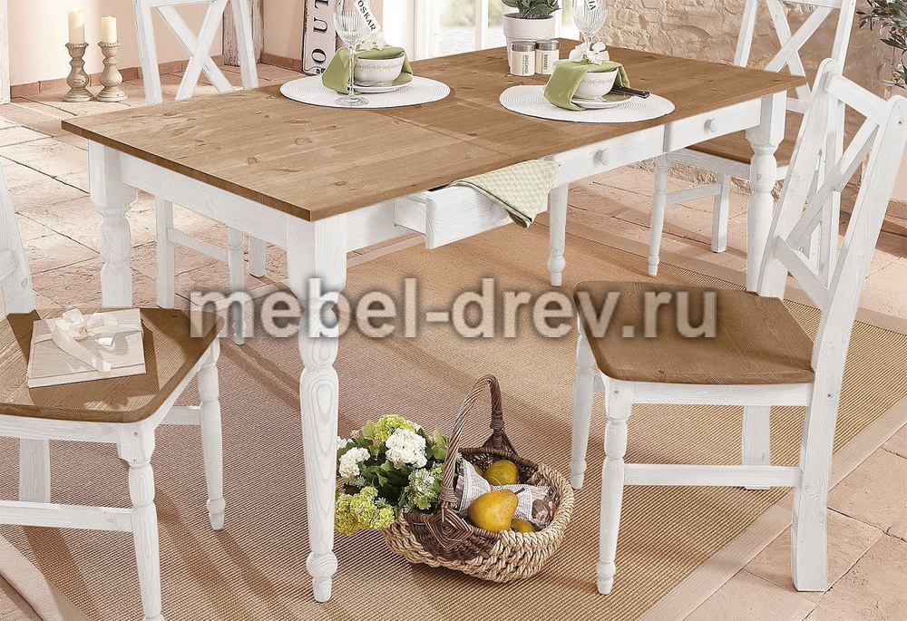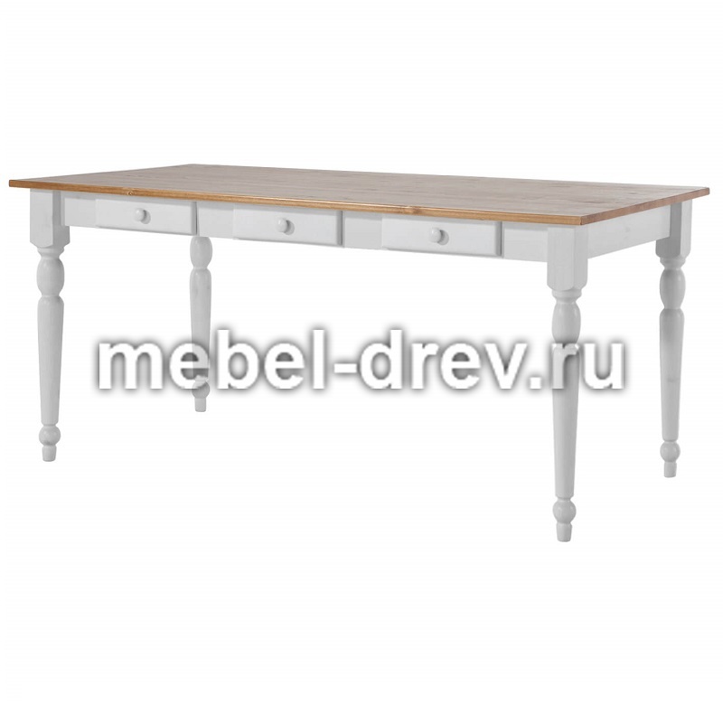 Большой вместительный обеденный стол из натурального дерева, массива сосны. Стол Ноа среднего размера, 160х80 см, отлично подойдет для кухни или гостиной средних размеров. Стол на точеных резных ножках, не раскладывается, под столешницей находятся три выдвижных ящика для кухонных мелочей. Сочетание контрастных цветов столешницы и корпуса в стиле Прованс сделает кухню или гостиную уютной и комфортной.