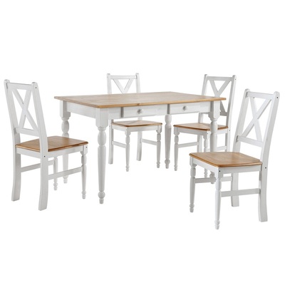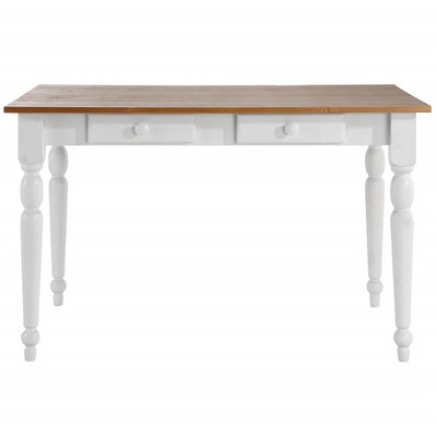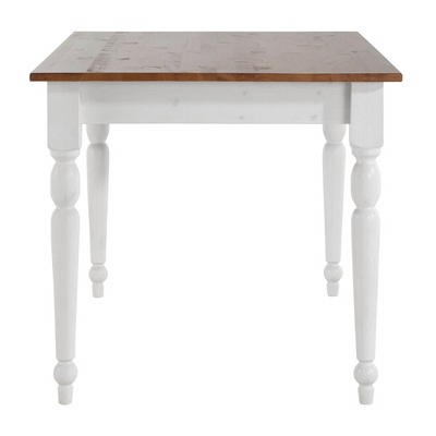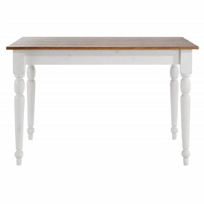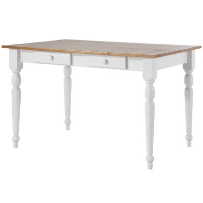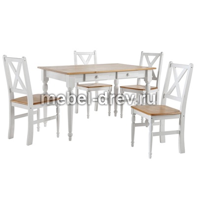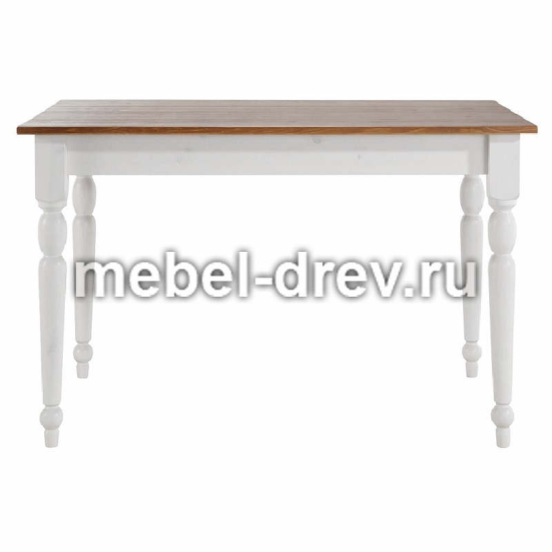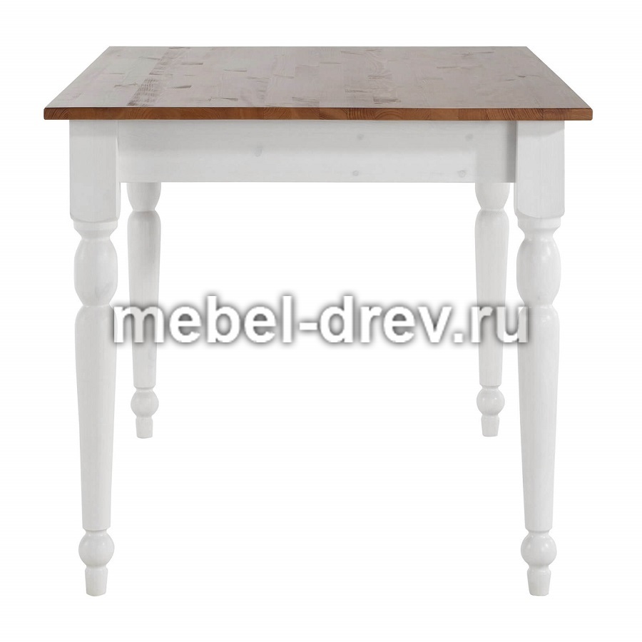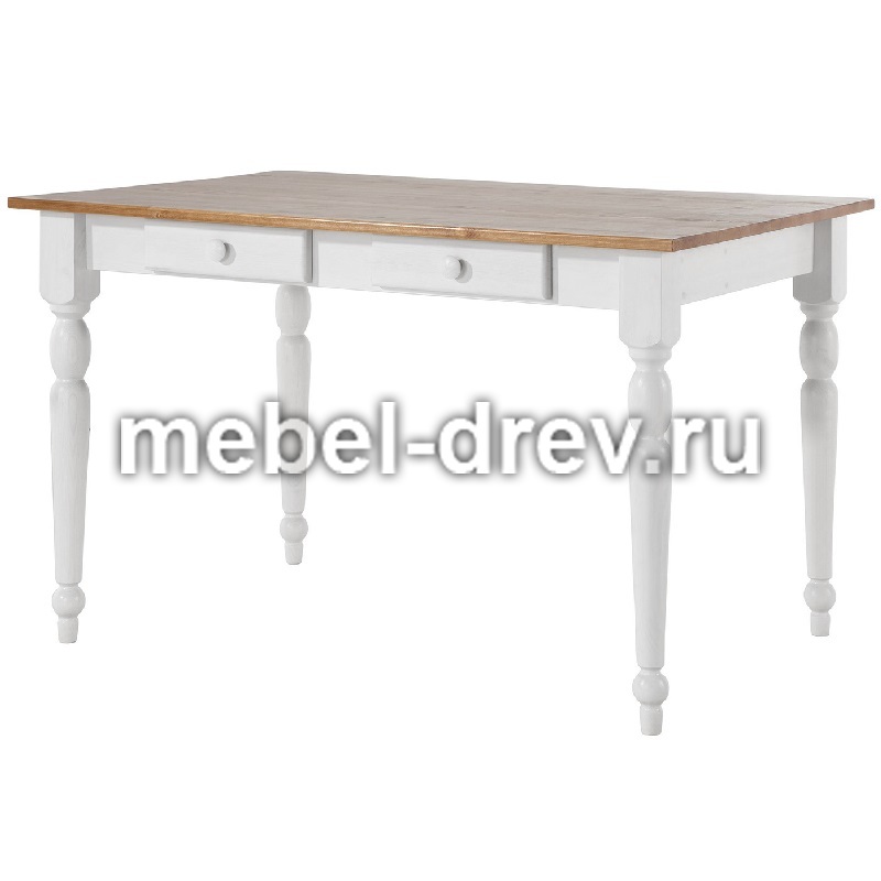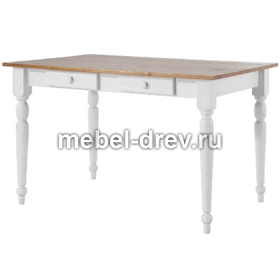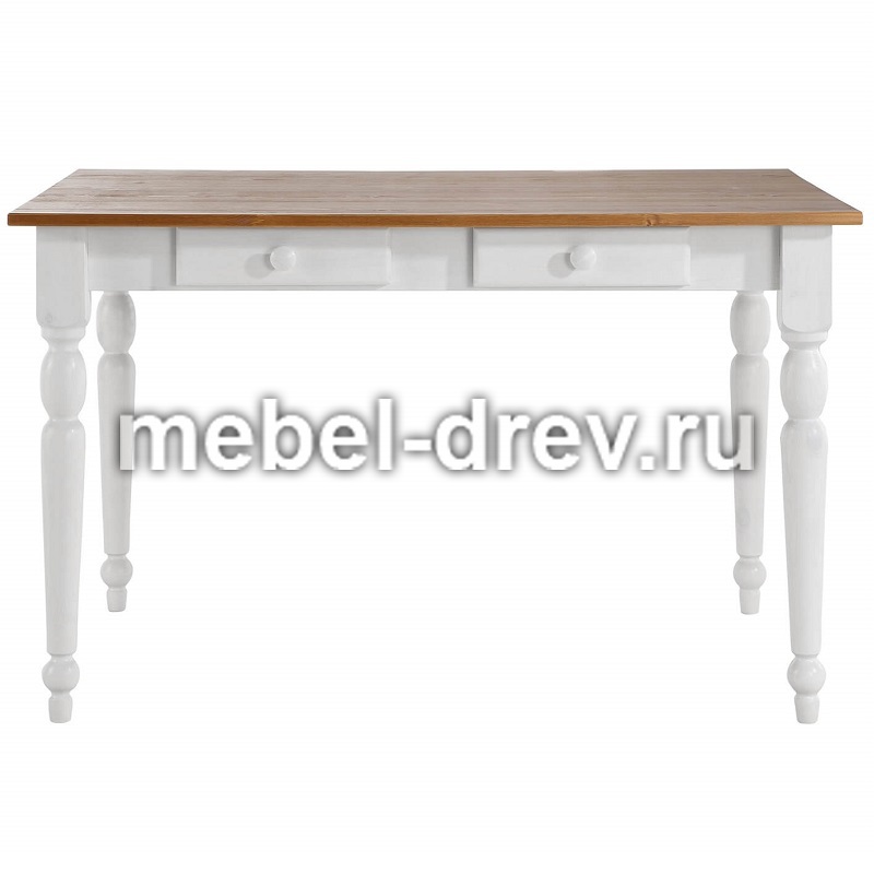 Небольшой обеденный стол из натурального дерева, массива сосны. Стол Ноа небольшого размера, 105х80 см, отлично подойдет для небольшой кухни. Стол на точеных резных ножках, не раскладывается, под столешницей находятся два выдвижных ящика для мелочей. Сочетание контрастных цветов в стиле Прованс сделает кухню или гостиную уютной и комфортной.