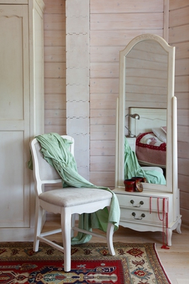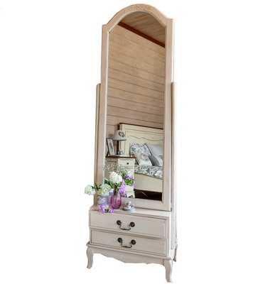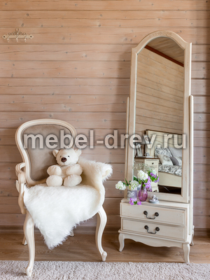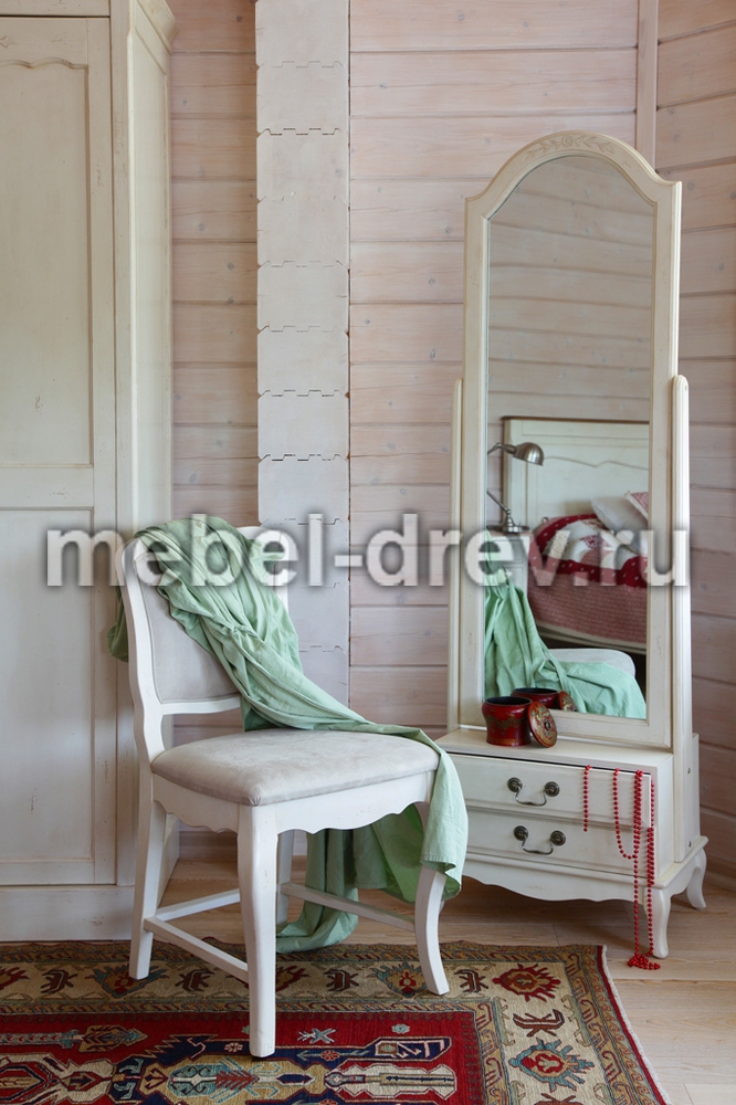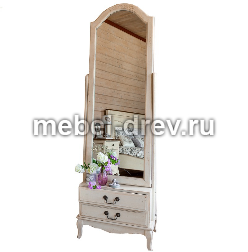 Большое напольное зеркало на поворотном механизме (зеркало-псише) из коллекции Belveder (Бельведер). Сделано из массива березы и ясеня, в итальянском стиле. С искусственно состаренной поверхностью, в цвете "белая карамель". Внизу, под рамой зеркала, расположены 2 выдвижных ящика для мелочей.