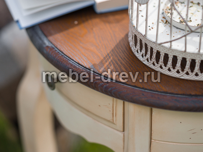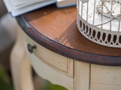 Чайный столик или маленькая консоль из коллекции Belveder (Бельведер). Сделана из массива березы, в итальянском стиле. С искусственно состаренной поверхностью, в цвете "белая карамель". Столешница сделана из ясеня, в контрастном цвете "орех", с выдвижным ящиком под столешницей.