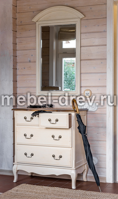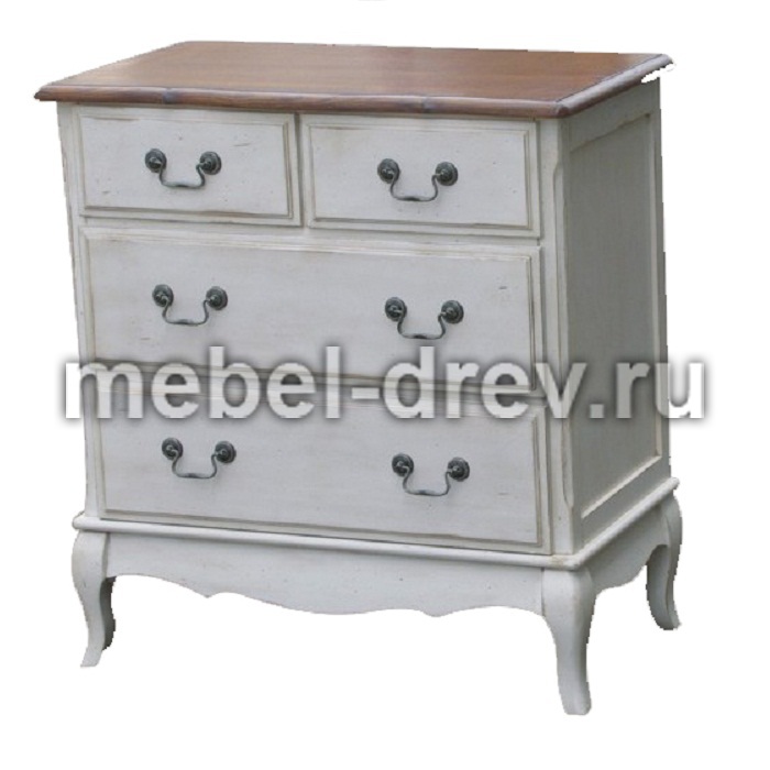 Изящный небольшой комод с 4 ящиками из коллекции Belveder (Бельведер). Изготовлен из массива березы, в итальянском стиле. С искусственно состаренной поверхностью, в цвете "молочный с эффектом старения", со столешницей контрастного цвета "итальянский орех". Натуральное дерево будет вас радовать качеством долгие годы.