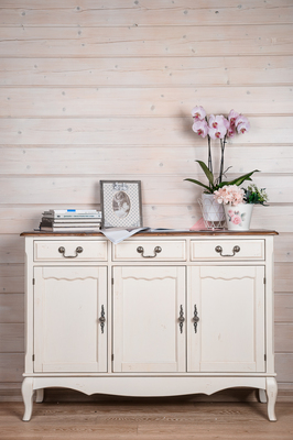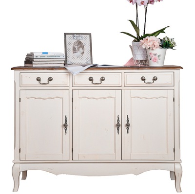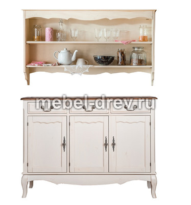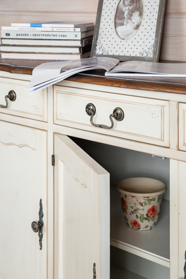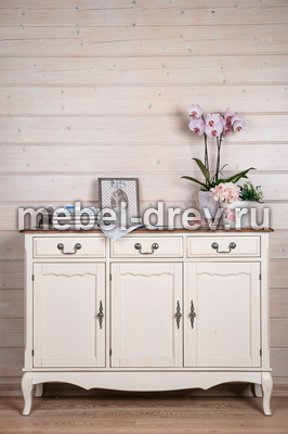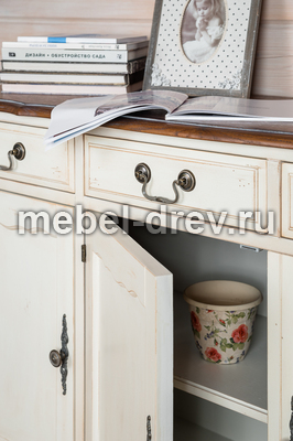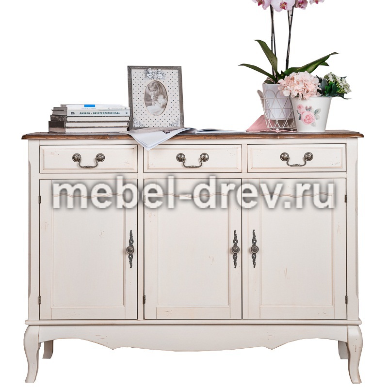 Большой вместительный комод из коллекции Belveder (Бельведер). Сделан из массива березы, в итальянском стиле. С искусственно состаренной поверхностью, в цвете "белая карамель", со столешницей контрастного цвета "орех". У комода 3 выдвижных ящика и полочки за распашными дверцами.