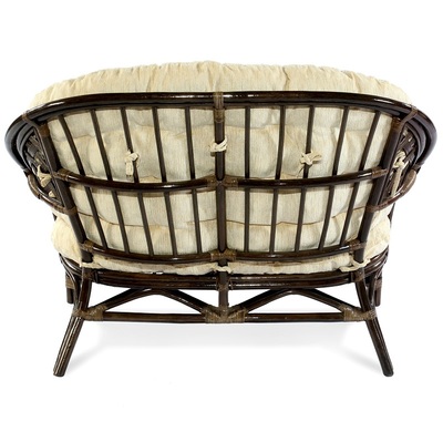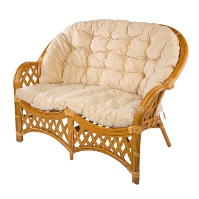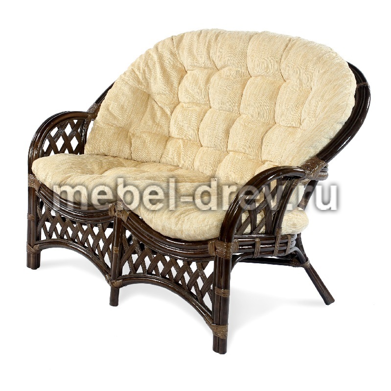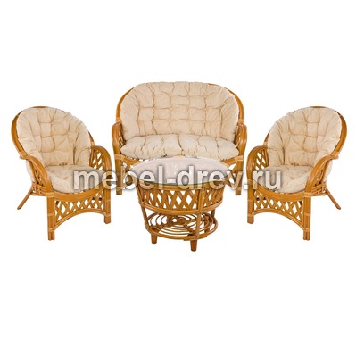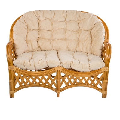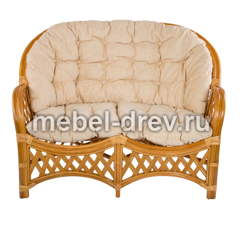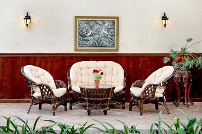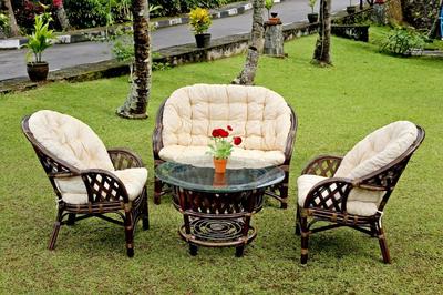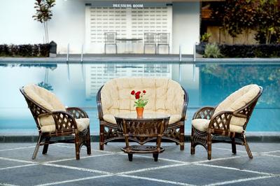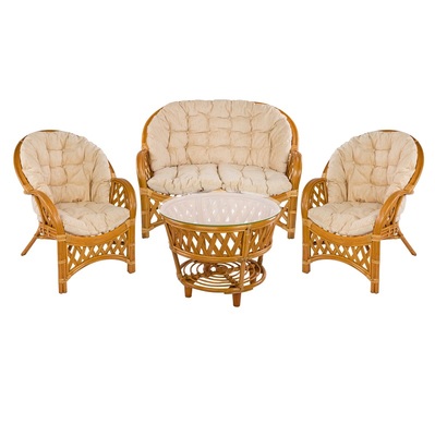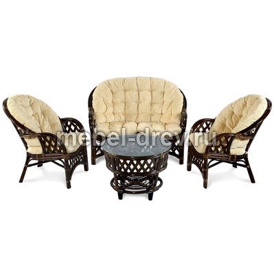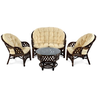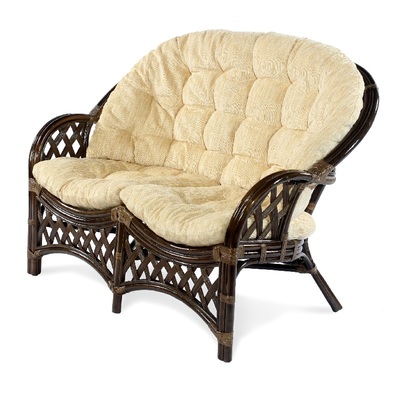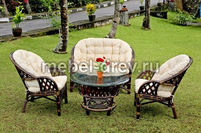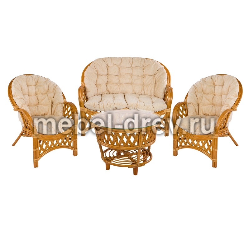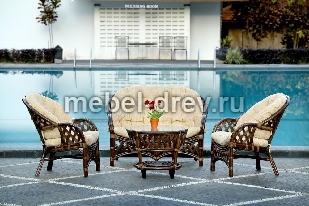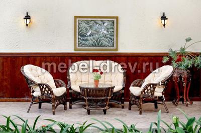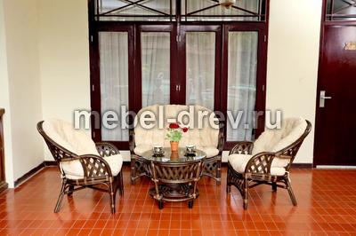 Комплект Рузвельт для летней веранды или сада из гибкого, прочного натурального ротанга. Ротанг может выдержать очень большой вес, при этом изделия из него очень легкие. Мебель из ротанга не рассыхается, не выцветает, влагоустойчива, пригодна для использования в бассейне, сауне, неотапливаемом помещении. В комплекте мягкие подушки, обиты тканью шенилл 143.