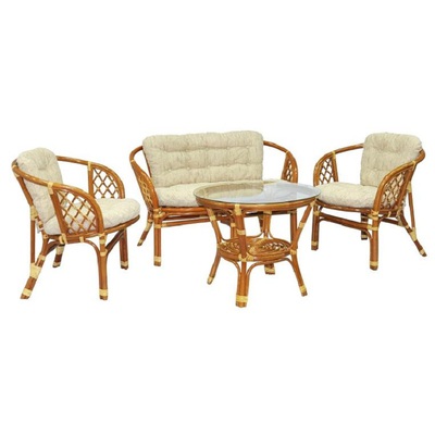 Комплект Багама 03/10 для летней веранды, сада или кафе из гибкого, прочного натурального ротанга. Ротанг может выдержать очень большой вес, при этом изделия из него очень легкие. В данном комплекте используется плетение в 3 ствола ротанга, что увеличивает прочность каркаса. В комплект входит диван, 2 кресла и столик. Также прилагаются подушки из рогожки, в белом варианте - шенилл.