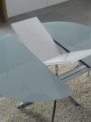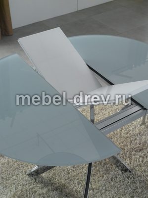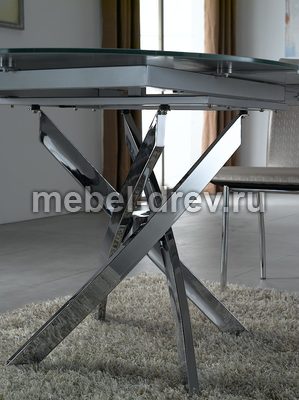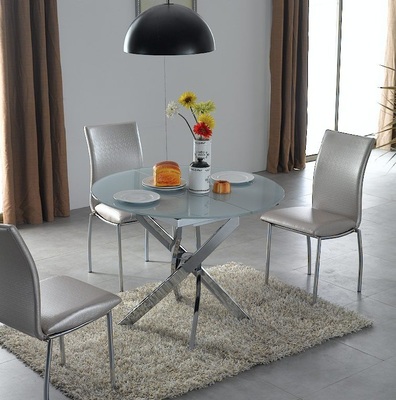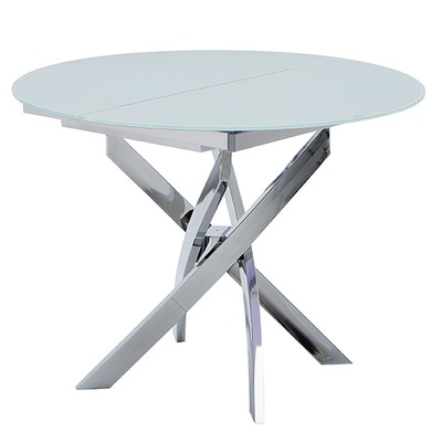 Простой и элегантный современный стол в стиле модерн. Стол с раздвижной столешницей. На надежном основании,-оригинальных ножках из металла, столешница из толстого закаленного стекла. Стол раскладной, с помощью вкладки 29 см раскладывается до 129 см. Тип раскладки-бабочка.