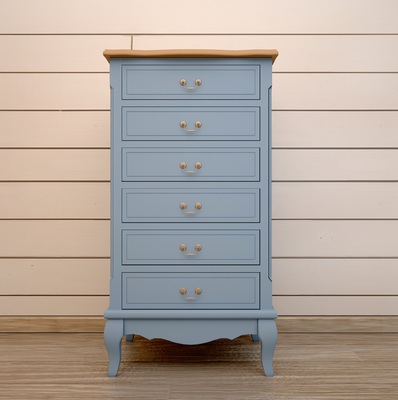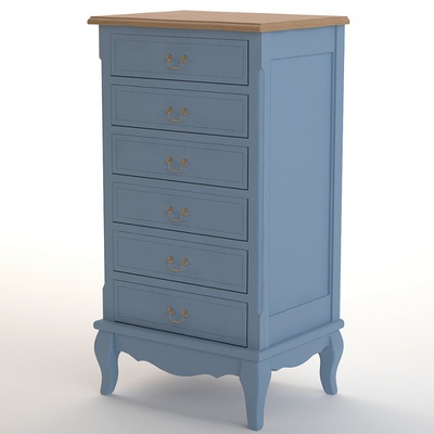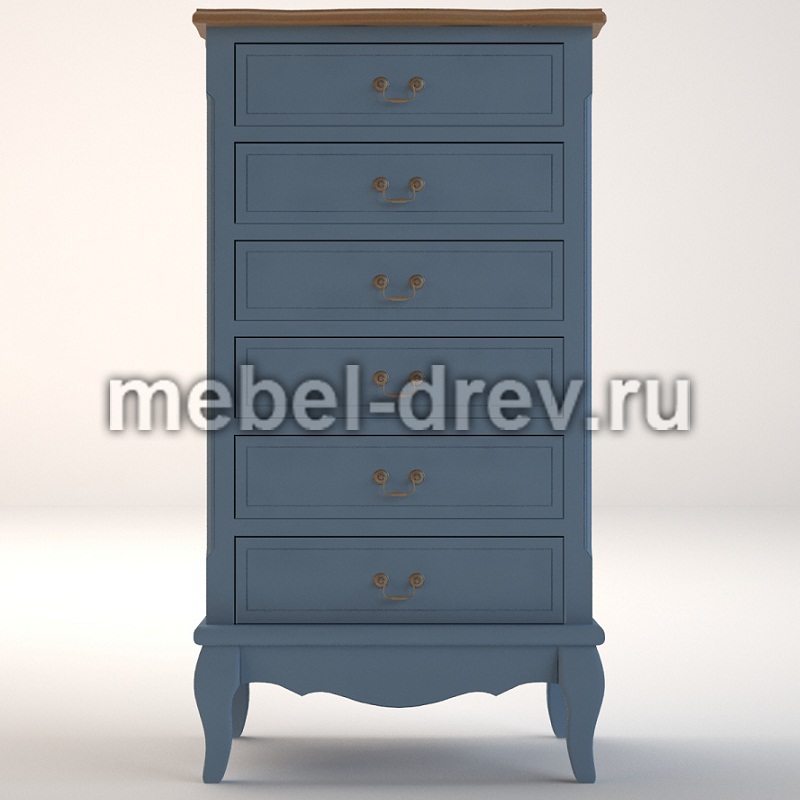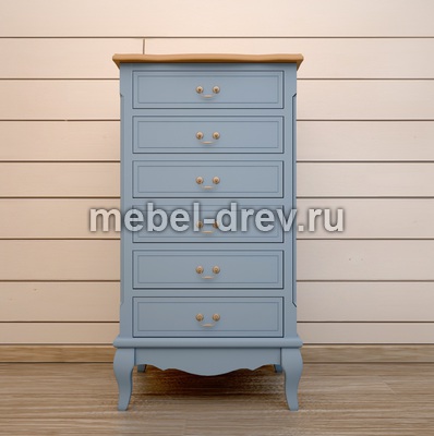 Высокий и узкий резной комод на изогнутых ножках Leontina/Леонтина. Сделан в стиле Прованс, с большим количеством выдвижных ящиков, из натурального дерева: каркас-массив березы, столешница-ясень. Необычный голубой цвет коллекции Леонтина блю придает интерьеру ощущение беззаботности и покоя, чистоты и благополучия.