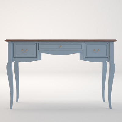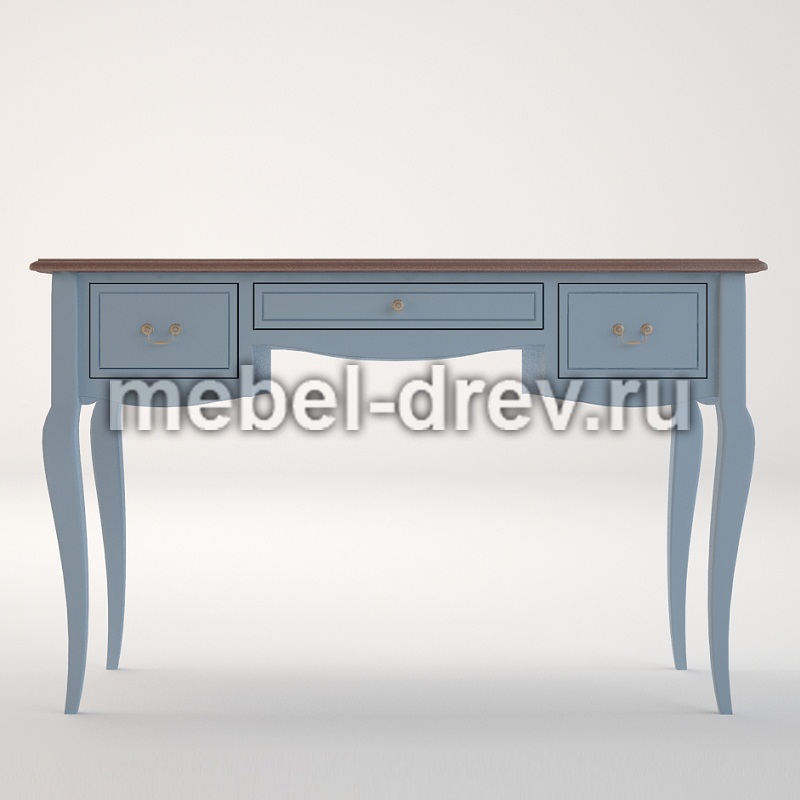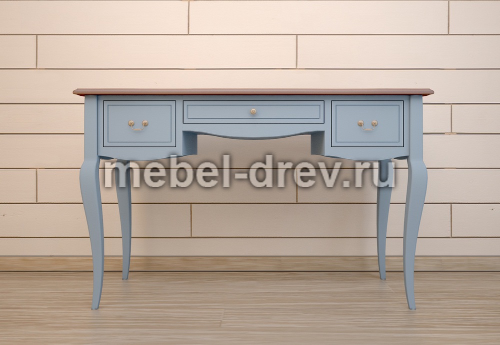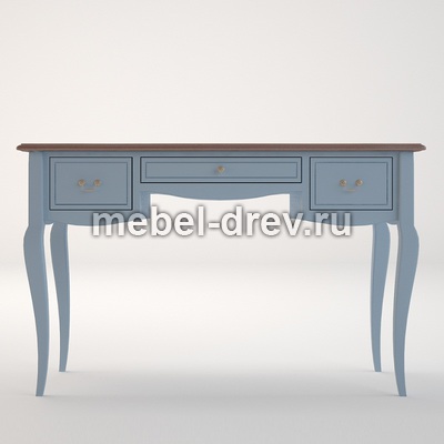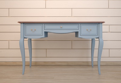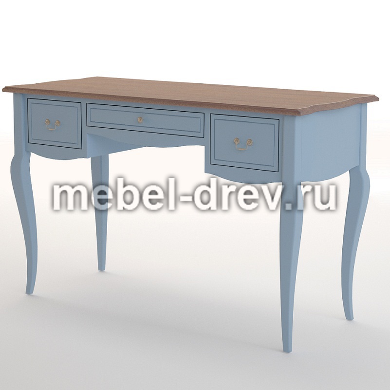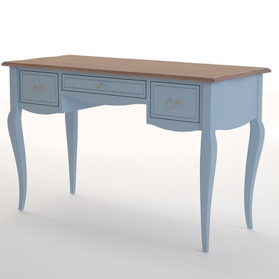 Письменный стол на изящных изогнутых ножках Leontina/Леонтина. Сделан в стиле Прованс, с тремя выдвижными ящиками. Стол изготовлен из натурального дерева: каркас-массив березы, столешница-ясень. Необычный голубой цвет коллекции Леонтина блю придает интерьеру ощущение беззаботности и покоя, чистоты и благополучия.