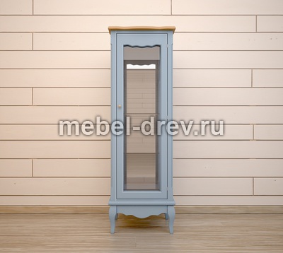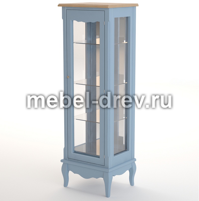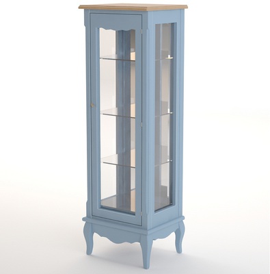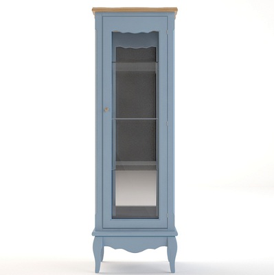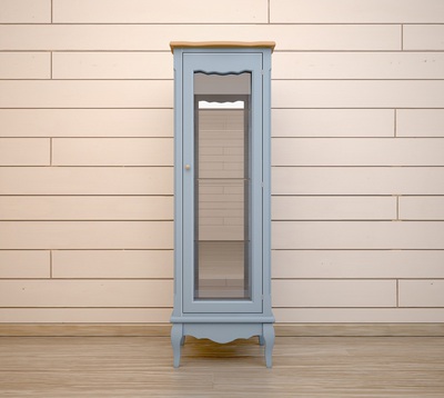 Узкая невысокая витрина в стиле Прованс из серии Leontina/Леонтина. Необычный голубой цвет коллекции Леонтина блю придает комнате нежность и очарование. Витрина на изогнутых ножках, задник витрины-зеркало, дверцы при закрывании фиксируются на магнитах. Изготовлена из натурального дерева: каркас-массив березы, верх-ясень.
