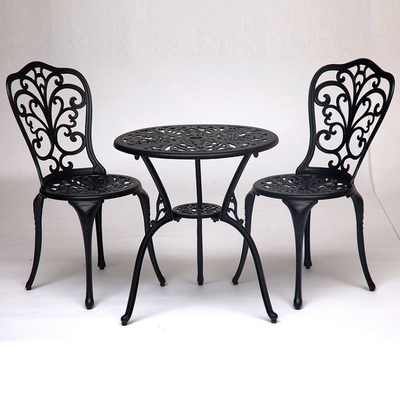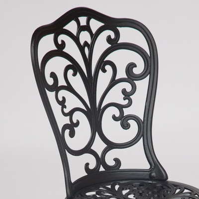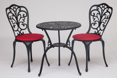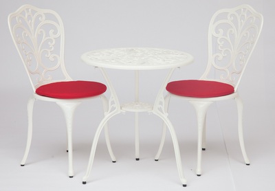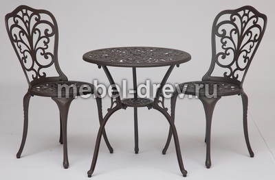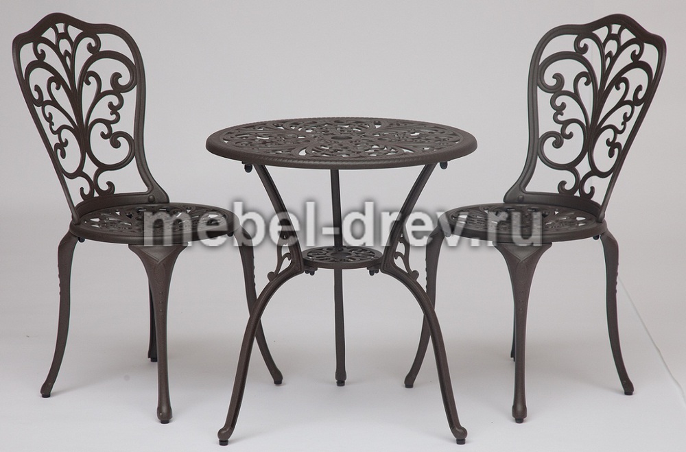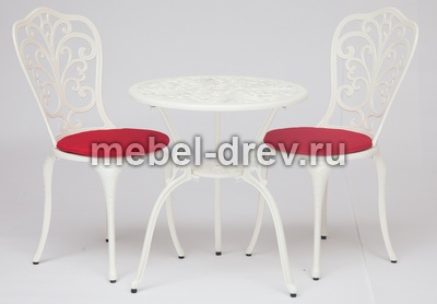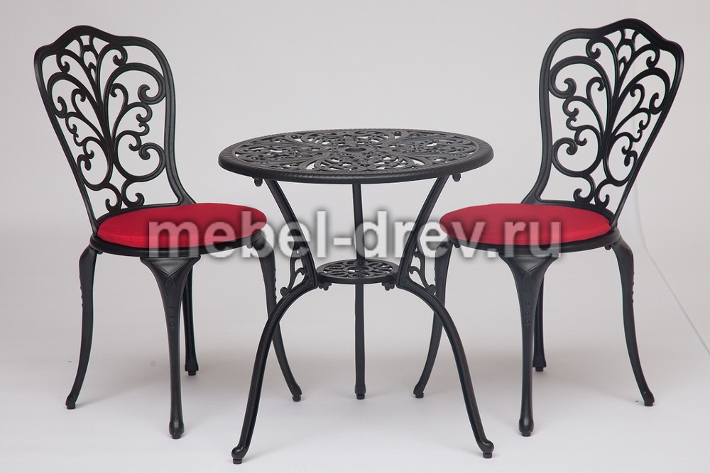 Изящный кованый набор из 2 стульев и столика для сада и веранды. К стульям можно приобрести дополнительно быстросохнущее мягкое сиденье из полиэстера (350 руб/шт).
