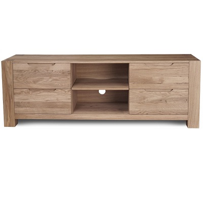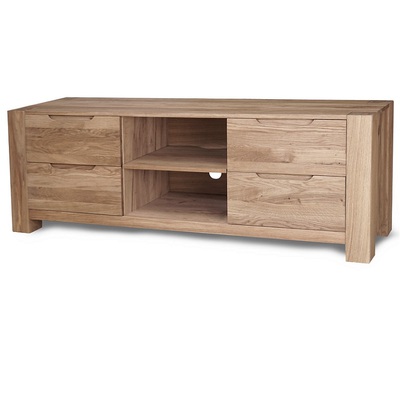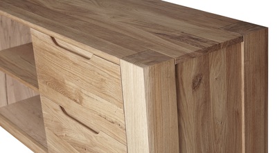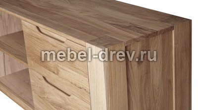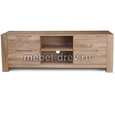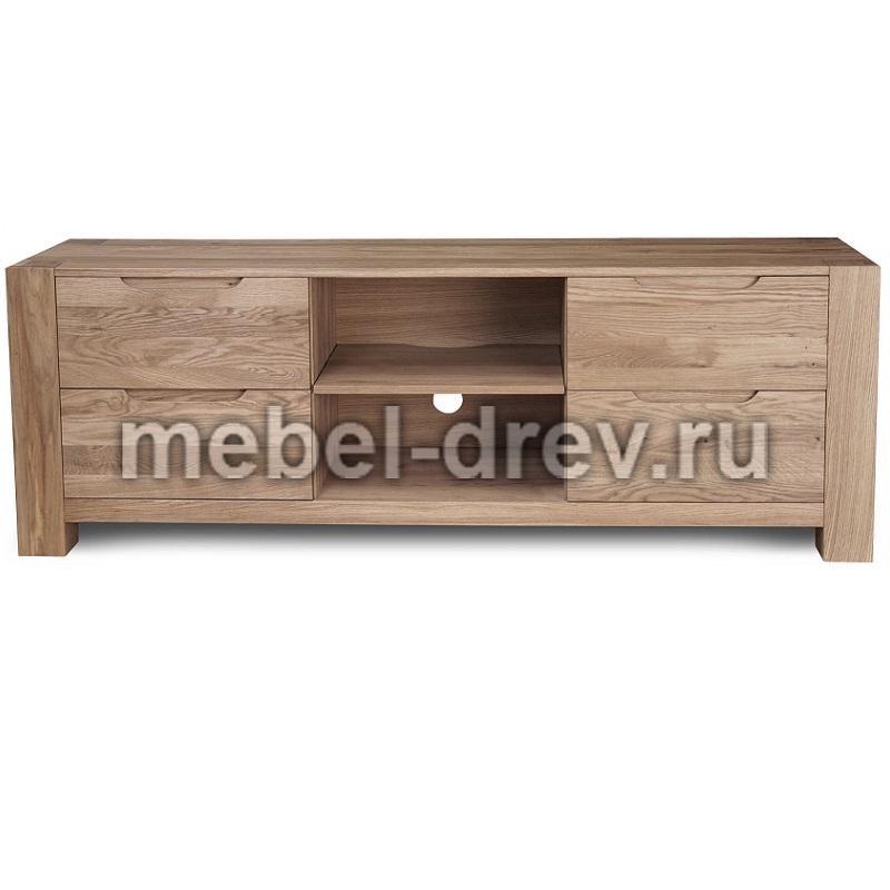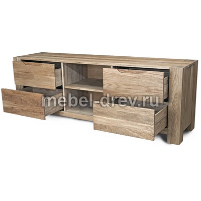 Тумба под ТВ РИВА из массива дуба в современном модном стиле Лофт. У тумбы ниши, позволяющие разместить аппаратуру и четыре выдвижных ящика по бокам тумбы. В выдвижных ящиках установлены направляющие европейского производства Hettich. Направляющие снабжены доводчиком и механизмом бесшумного открытия и закрытия. Прозрачная отделка фасадных поверхностей не скрывает многообразие природного цветового различия древесины дуба, а также сучки, маленькие трещинки и червоточины (имитация искусственного старения).