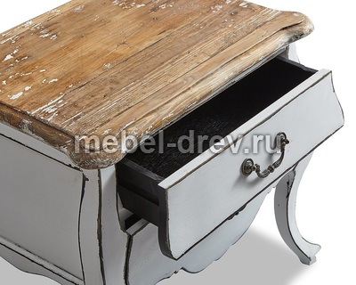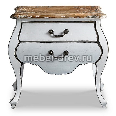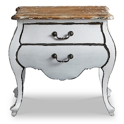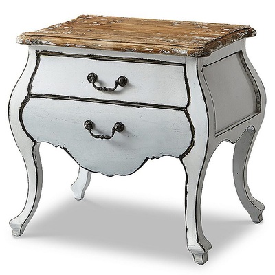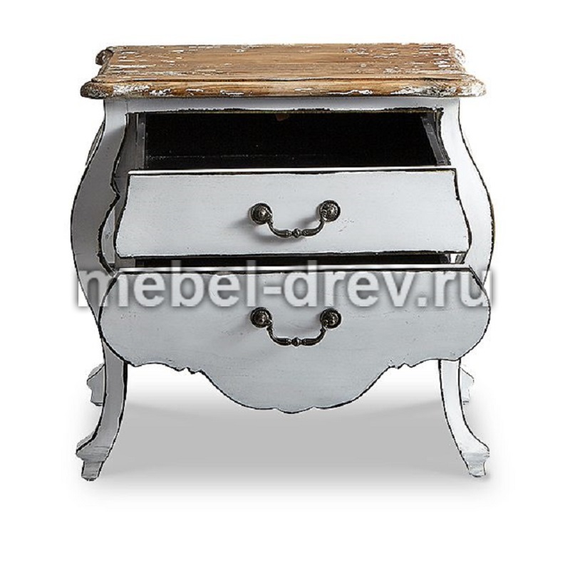 Небольшая прикроватная тумба с 2 выдвижными ящиками в стиле Прованс, на изящно изогнутых ножках. Тумба изготовлена из массива гевеи, выкрашена в элегантный светлый цвет со столешницей в цвете орех. Изделие искусственно состарено по всем боковым поверхностям, имеет как бы следы "отшелушенной", состаренной краски. Столешница тумбы также имеет следы искусственного старения со следами "старой" краски. Элегантная фурнитура дополняет образ тумбы в стиле Прованс.