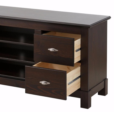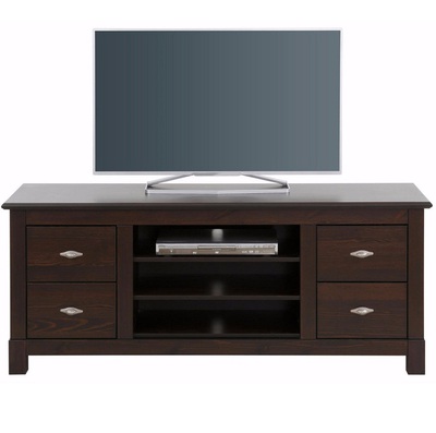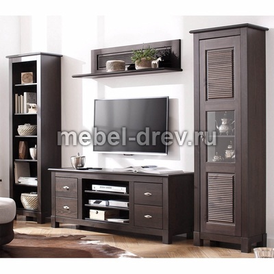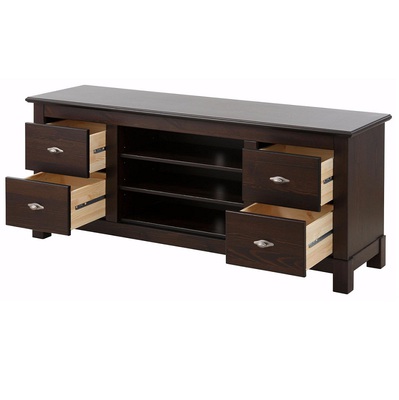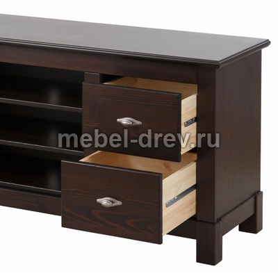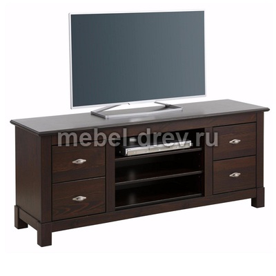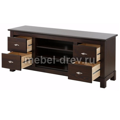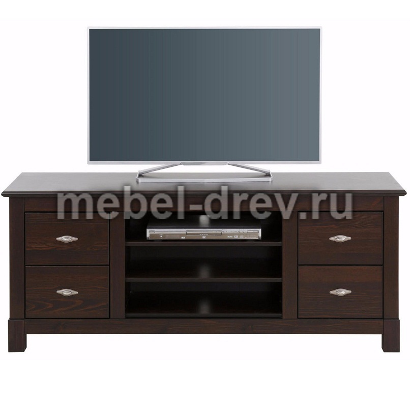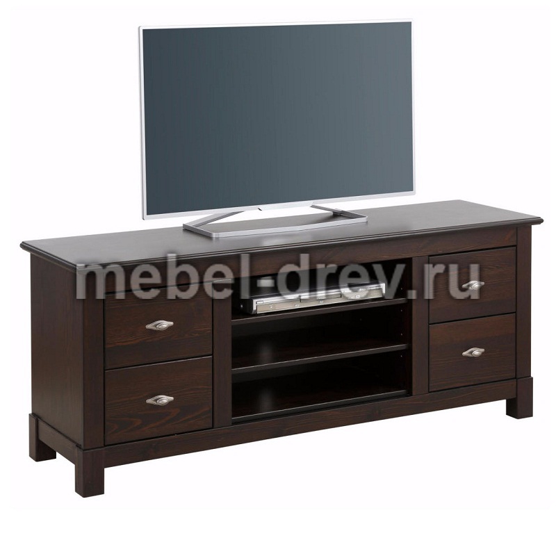 Тумба под ТВ из натурального дерева, массива сосны. Классический насыщенный цвет тумбы как нельзя лучше подчеркивает прямые формы и строгую геометрию изделия, и придется по душе любителям классической мебели. Тумба Рауна оснащена четырьмя удобными выдвижными ящиками, которые позволят удобно разместить аудио- и видеоаппаратуру.