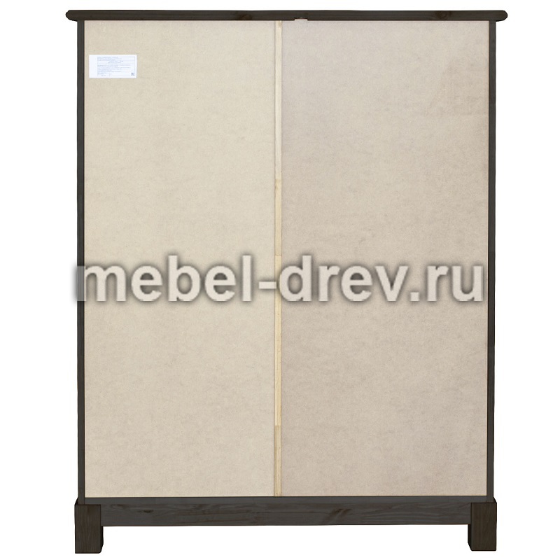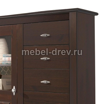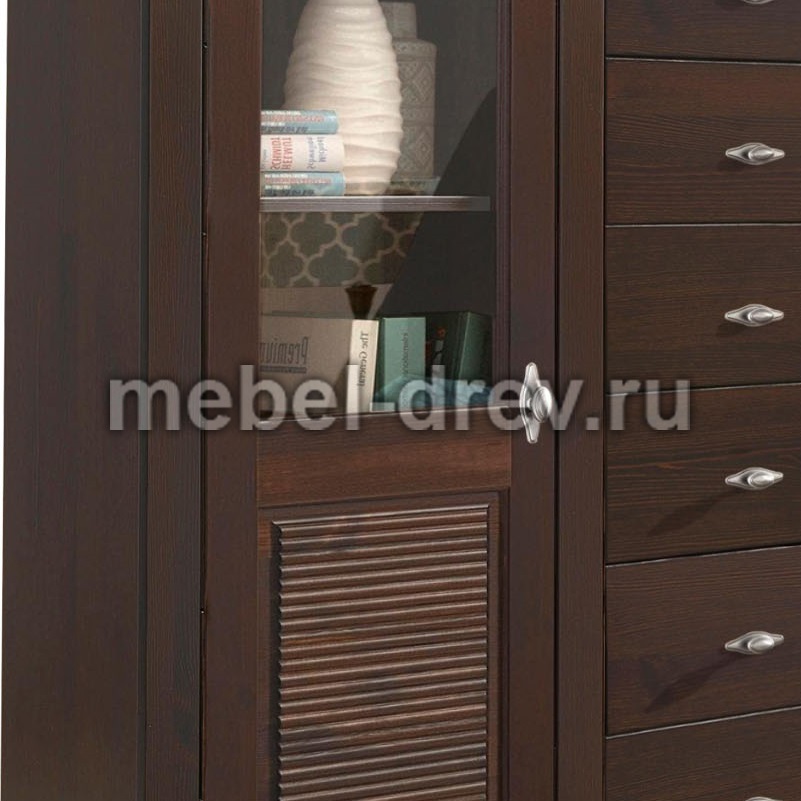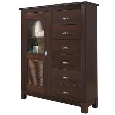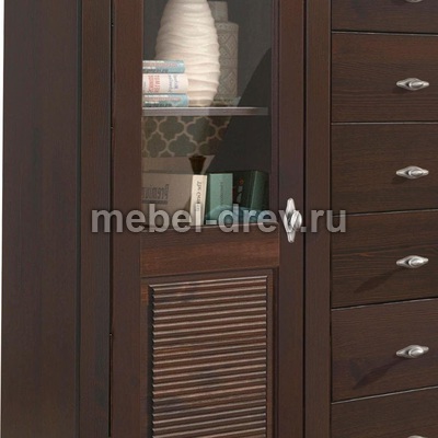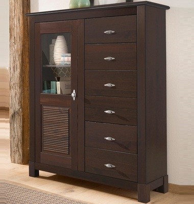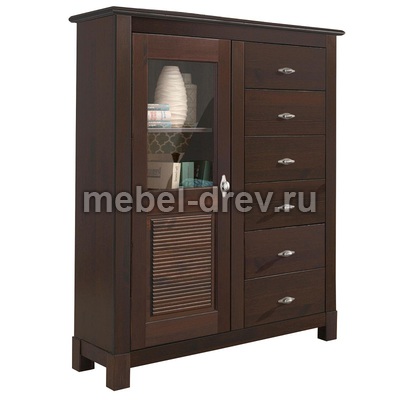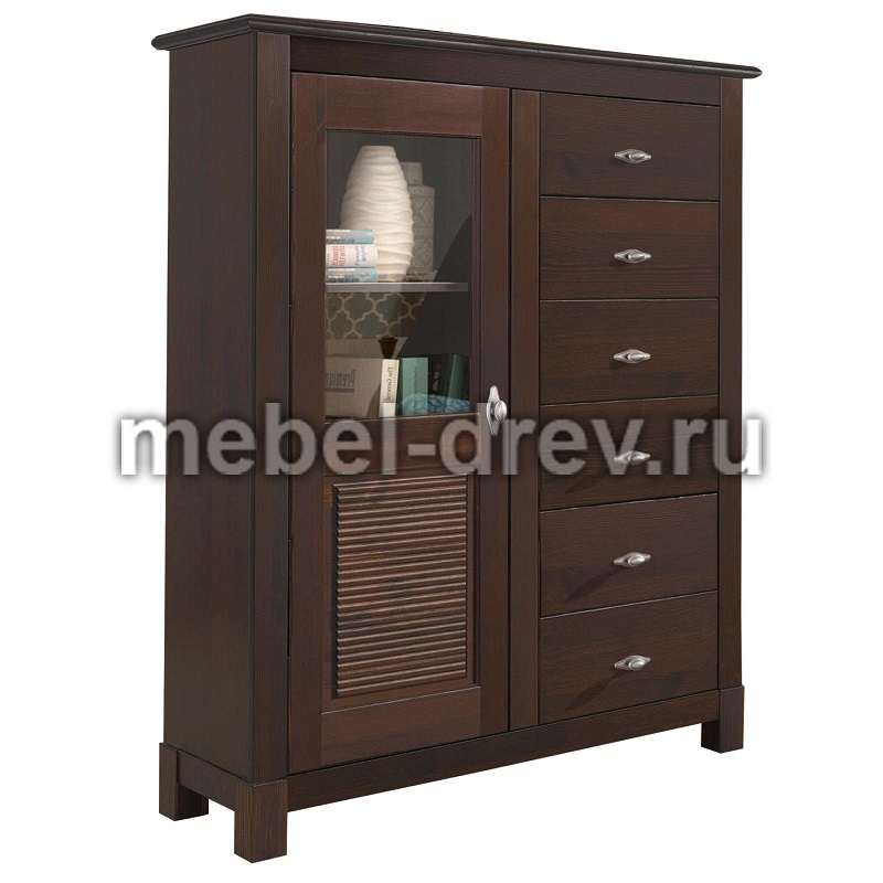 Комод с дверцей и ящиками Рауна из массива сосны. Мебель серии Рауна отличают строгие прямые линии и минимум декора. Благородный темно-коричневый цвет комода придется по душе любителям классической мебели. У комода Рауна шесть удобных выдвижных ящиков, которые обеспечат удобное хранение мелких предметов, а также полочки за наполовину стеклянной распашной дверцей.