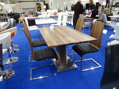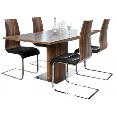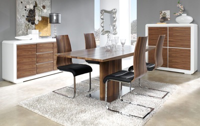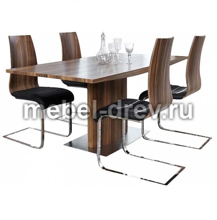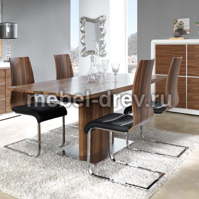 Простой и элегантный современный стол в стиле модерн от испанской фабрики Dupen. Изготовлен на хромированном металлическом основании, в основном цвете орех. Нога сделана из МДФ, столешница из шпонированной МДФ. Стол раскладной, с помощью вкладки 40 см раскладывается до 2 м.